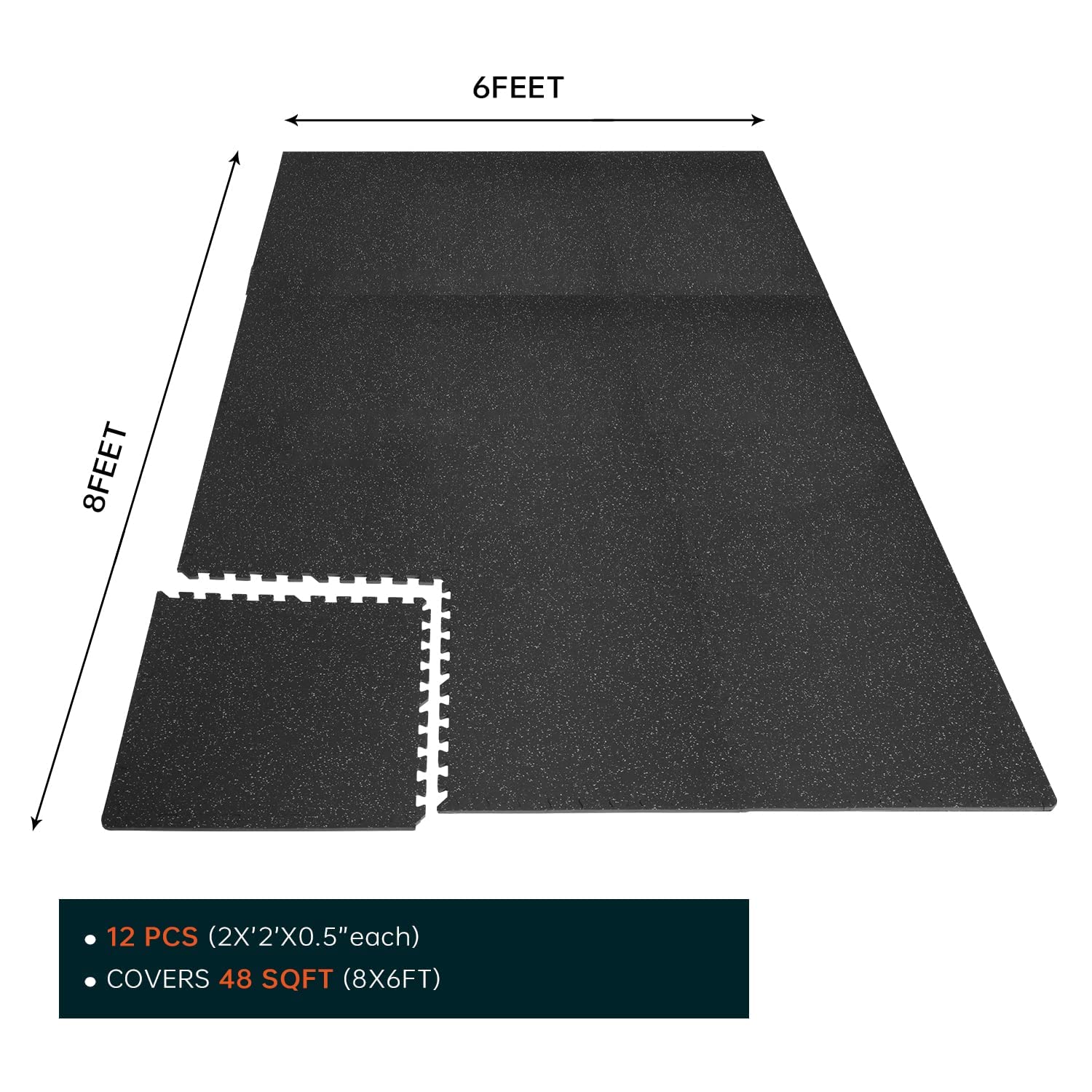 - Interlocking Puzzle Exercise Mats- Change Your Home to The Gym In Seconds: Each pack comes with 12 tiles(24' x 24' x0.56') and 24 borders to cover 48 square feet. Upgrade larger interlocking lock for grip together tightly. It was extremely easy to put together making a perfect workout and training space, just like being at the gym!