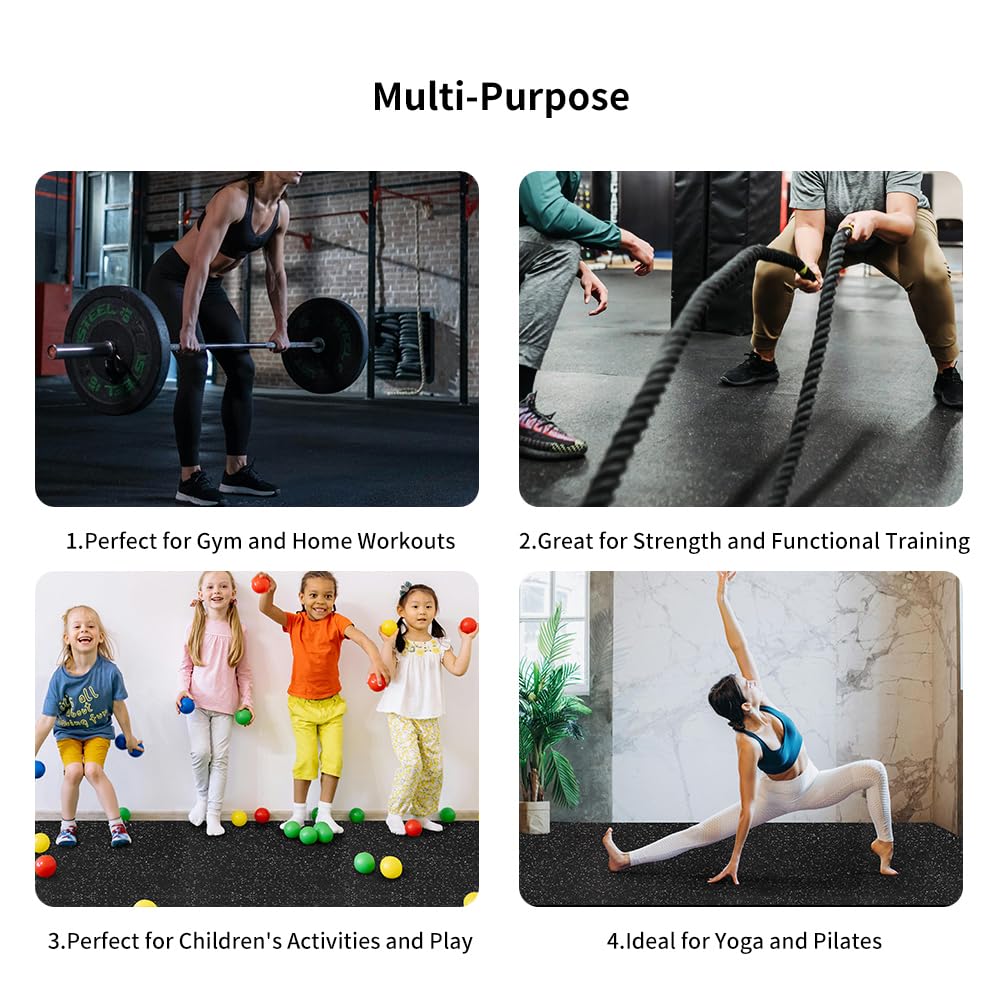 - Versatile Use: Ideal for a variety of activities including yoga, bench workouts, treadmill training, CrossFit, kettlebell exercises, and aerobic equipment or regular workouts. Additionally, the rubber tiles are perfect for children's or babies' playrooms, and any area in the home that requires extra cushioning and safety. They can be used almost anywhere, such as home gyms, garages, basements, kitchens, or offices, providing a comfortable standing experience whether you’re wearing shoes or not.