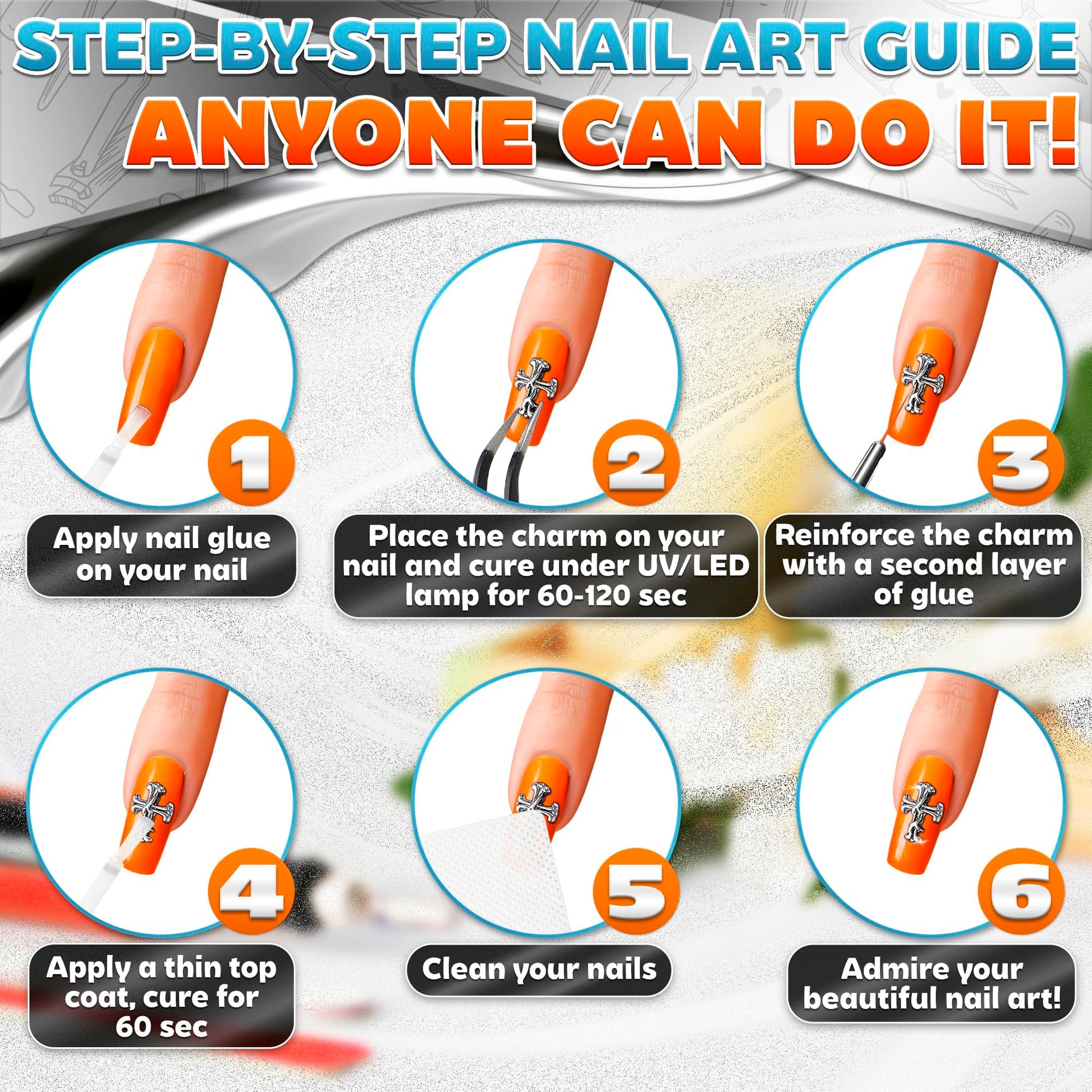 - Simple to Apply Nail Charms Silver Nail Decals: Clean your nails, add a base coat, place the cross gems for nails, & then secure with another primer layer. Achieve a good, shiny manicure with ease
