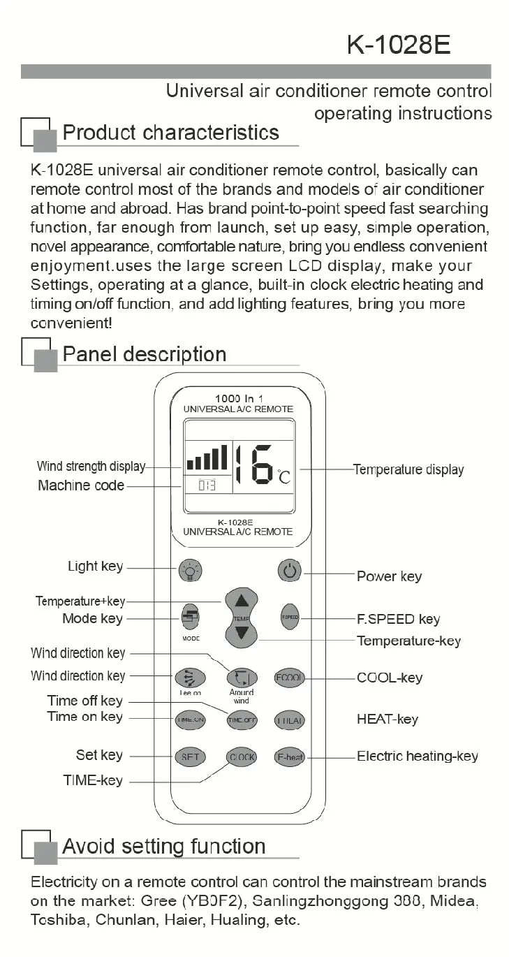 1000 in 1 Universal Remote Control K 1028E AC Digital LCD for Air Conditioner