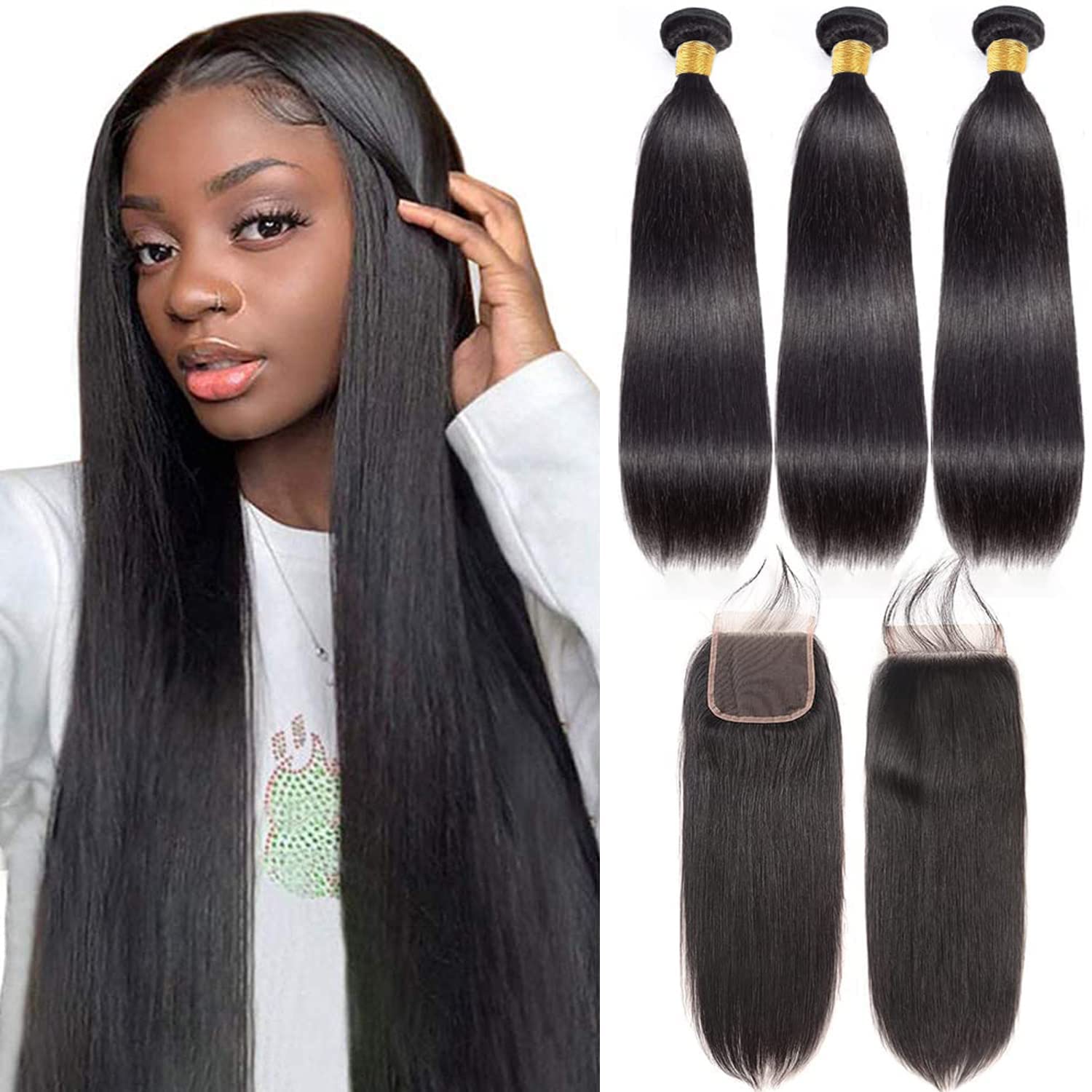 - 💖Bundles With Closure Human Hair Color and Weight: Natural color,10-28 inch available, true to length brazilian virgin hair straight bundles, 100±5g/bundle, 3 bundles with closure is enough for a full head;hand made swiss lace closure is 30-50g (depending on the length), lace closure size is 4x4.Hair is Soft and Healthy, full and thick,HD lace makes hair wear more comfortable and natural.