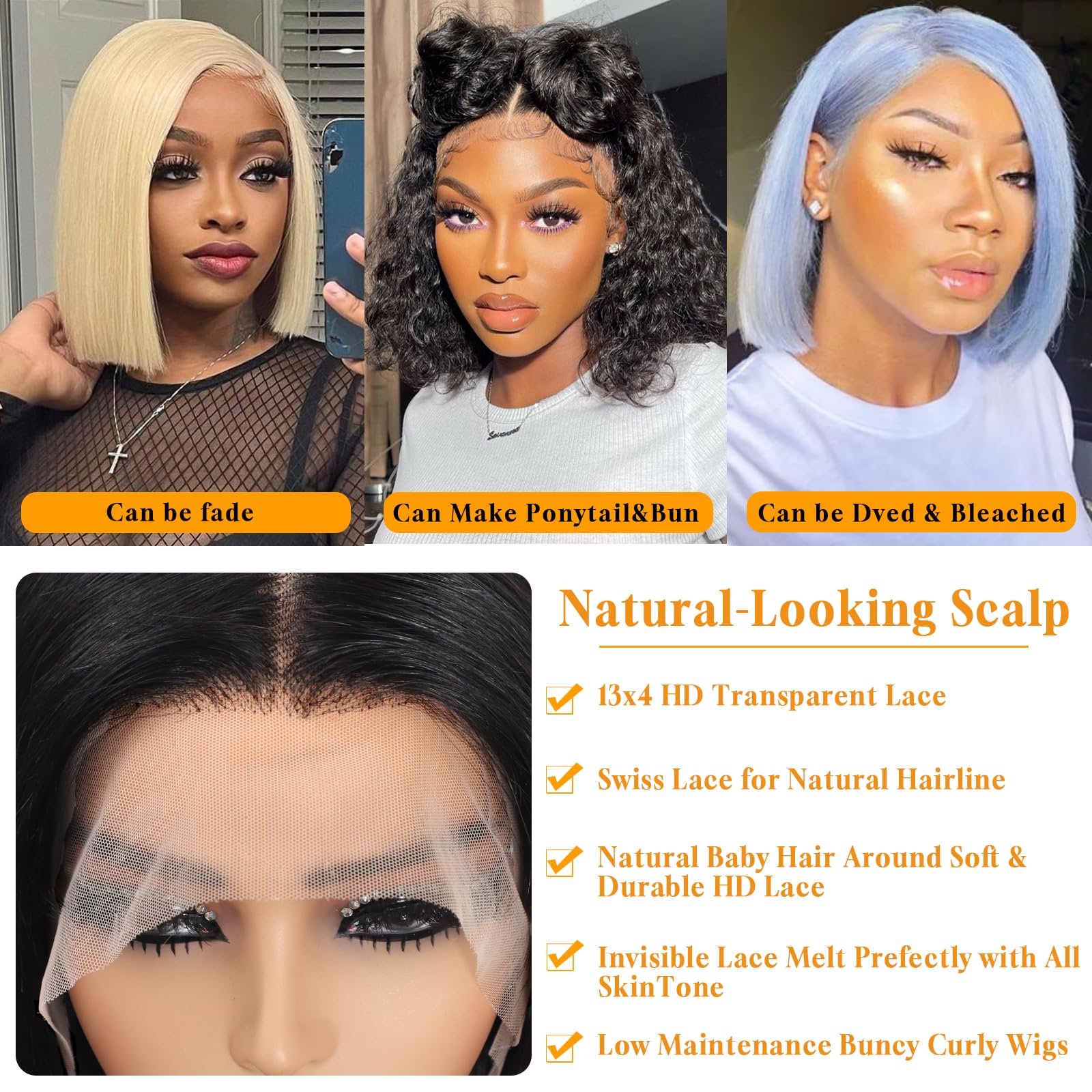 - 【Bob Lace Front Wig Human Hair Materia】100% Unprocessed 10A Brazilian Virgin Human Hair Curly Lace Frontal Wigs, Full and Thick, Natural Look, Health and Comfort, Soft and Bouncy, Can Be Dyed, Bleached, Straightened and Restyled.