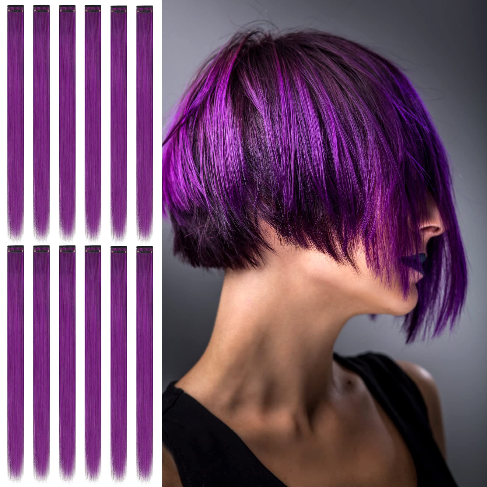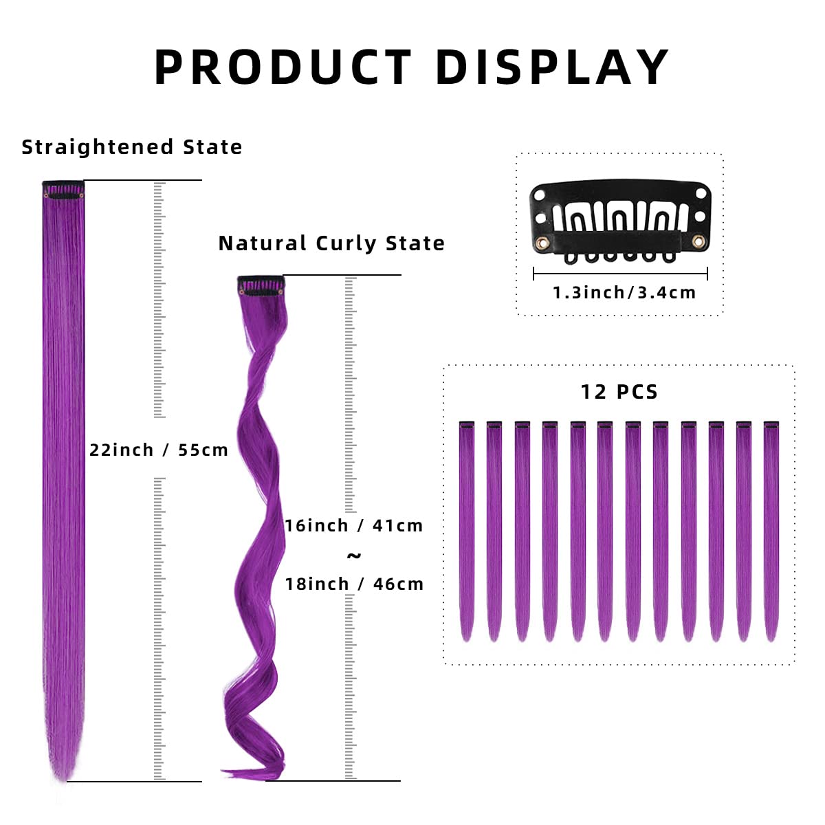 12 PCS Colored Clip in Hair Extensions, BEAHOT 22 Inch Rainbow Long Straight Hairpieces Clip in Synthetic, Halloween Cosplay Dress Up Fashion Party Christmas New Year Gift for Women Kids Girls, Purple