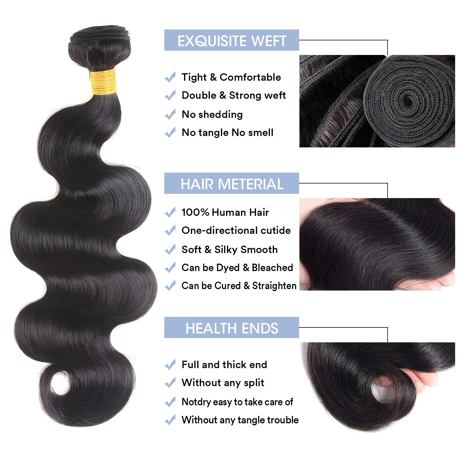 - Body Wave Bundles Advantages: 100% Brazilian Human Hair Bundles Can Be Dyed, Permed, Highlighted, Straightened, Curled or Restyled, Easy Mixed With Your Own Hair, Double Machine Weft, Hand Tied, Full And Smooth with Healthy Hair Ends; Tangle Free, Shedding Free, No Smell