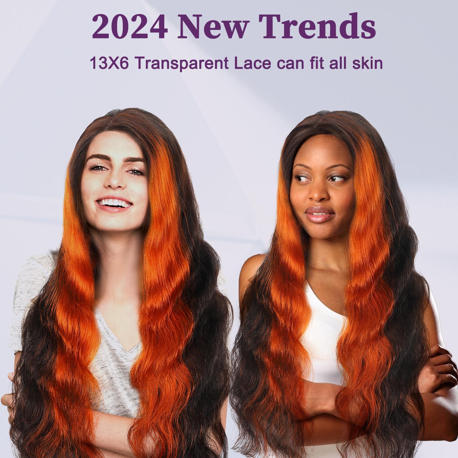 13x6 Ginger Orange Lace Frontal Wigs Body Wave Highlight Ombre Colored Human Hair 13x6 HD Transparent lace wigs Pre-plucked With Baby Hair 200% Density Glueless 100% Virgin Human Hair (26inch)