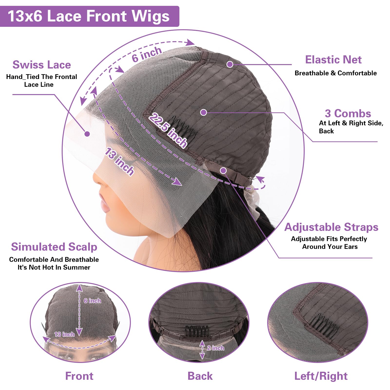 - 3.Glueless Lace Front Wigs Human Hair Cap Size: Medium size (22 inch - 22.5 inch) for most people perfectly. Body Wave Lace Front Wigs Human Hair Have 3 Combs Make It Easy to Install,Provides a Secure Fit to the Shape of Your Head, Ensuring that Everyone can Enjoy the Perfect Fit, more comfortable to wear.