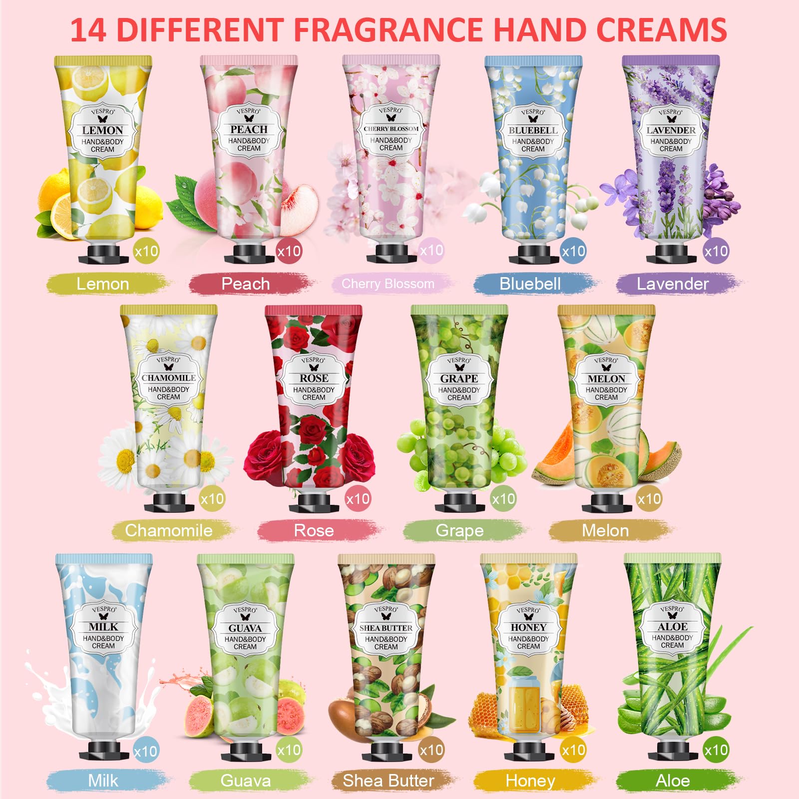 - 【140 Pack Hand Cream Gift Set】14 different scents,Including rose,lavender,cherry,blossom,chamomile,bluebell,peach,aloe,grape,lemon,melon,shea butter,guava,milk,honey.You can choose different fragrances every day to have a good mood.You can also share hand lotion with friends and familys.