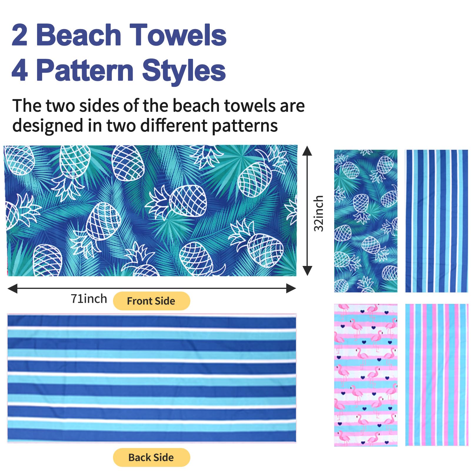 - MULTI-PURPOSE BEACH TOWELS: The beach towel set has an unfolded size of 71'x32', which is ideal for beach recreation, swimming pools, spas, saunas, gyms, yoga, travel, camping, and picnics. It is also ideal as indoor swimming towels.