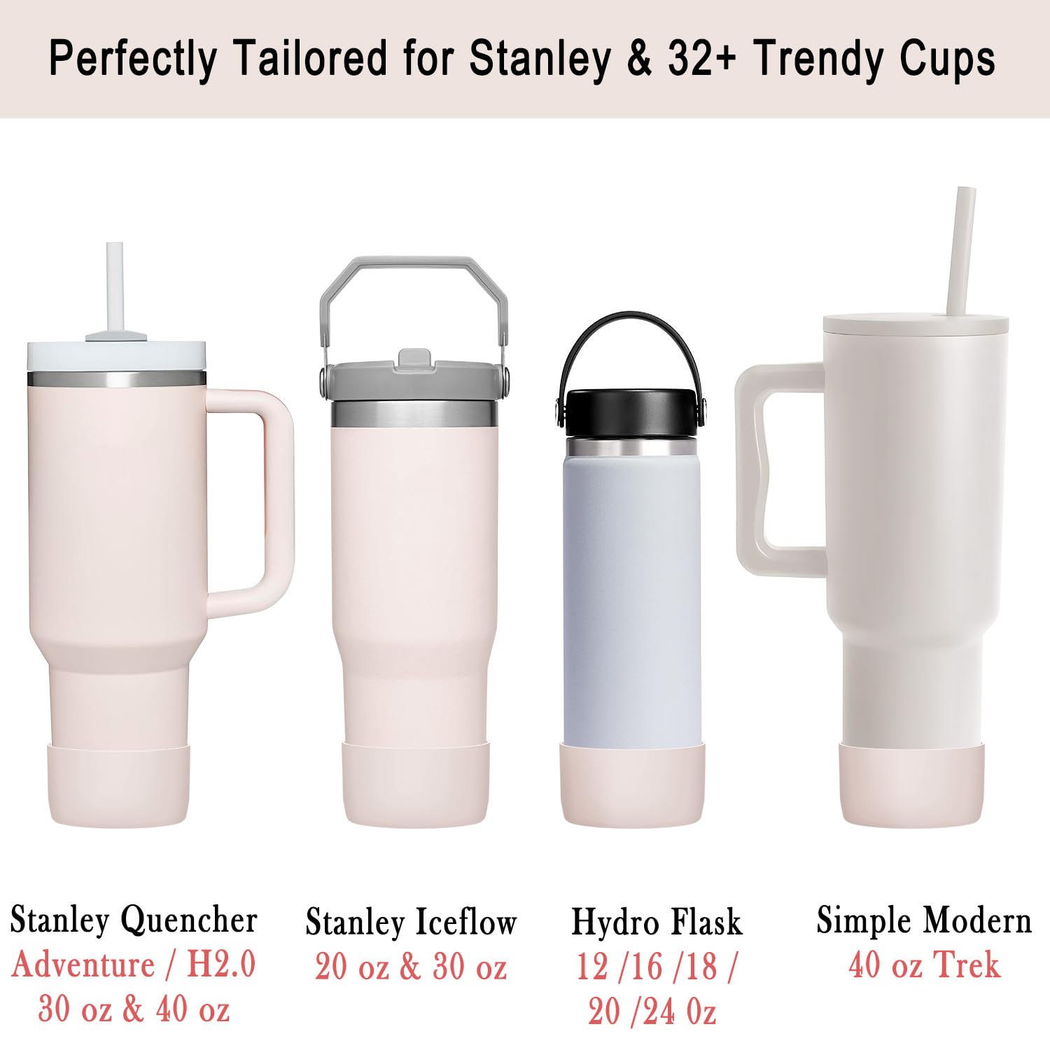 - ✨ Water Bottle Boot Fit Guide: Our versatile cup accessories boot is designed to snugly fit Stanley Adventure Quencher Travel Tumblers 20oz, 30oz, 40oz, Stanley H2.0 FlowState 30oz, 40 oz with handle, Stanley IceFlow Tumblers 20oz, 30 ounce, Hydro Flask water bottles 24 oz, 21oz, 20oz, 18oz, 16oz, 12oz, Hydro Flask 35/ 40 oz Travel Tumbler, and Simple Modern 30/ 40 oz Tumbler, Simple Modern 20/24/28 oz Classic & 14/ 18/ 22 oz Summit & 17/ 20/ 24 oz Ascent water bottle.
