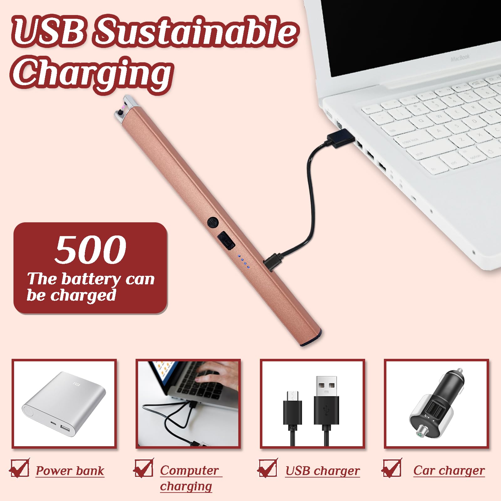 - [Easy Charging, Convenient Life] - The electric candle lighter is equipped with a USB charging cable, which is convenient for you to charge anytime and anywhere. There are 4 power indicator lights on the lighter handle. When only one light is on, please charge it in time. Each charge only takes 60 minutes to be fully charged. When fully charged, all 4 LED lights will light up. This rechargeable lighter can be charged over 500 times, so you don't have to worry about long-term use.