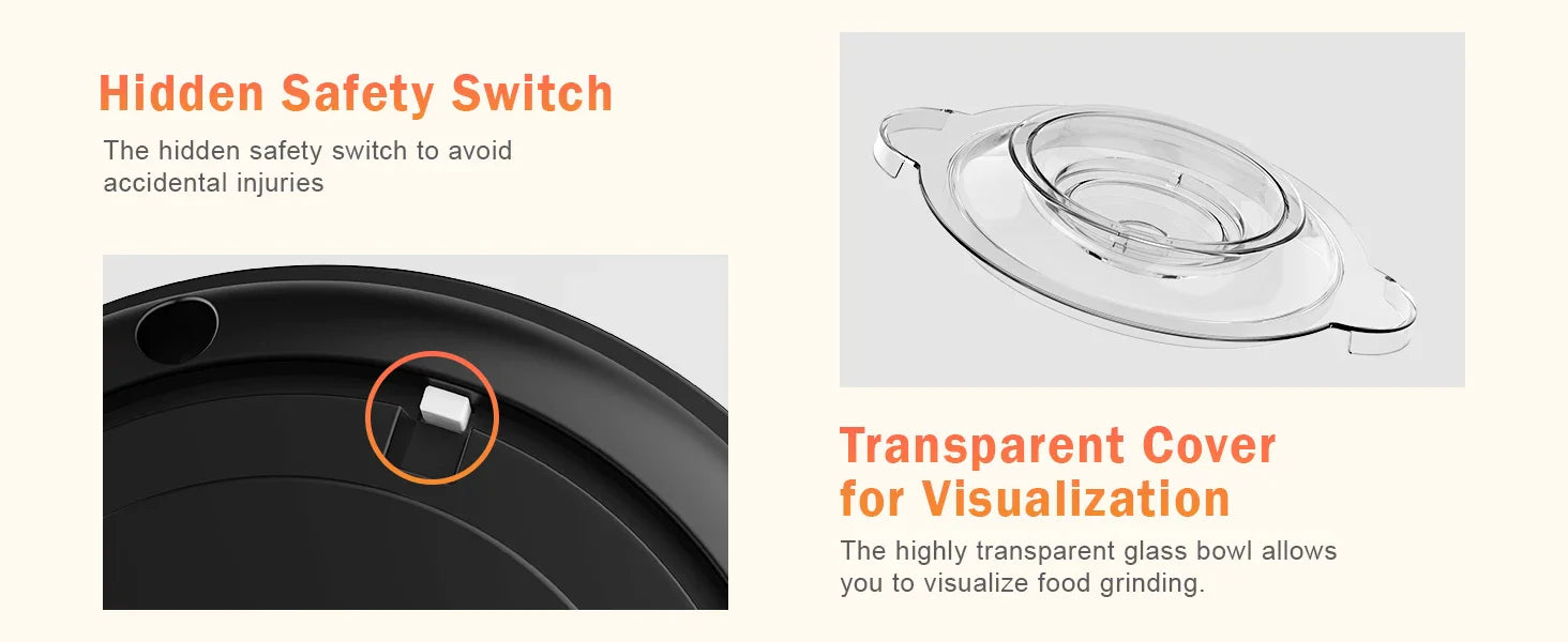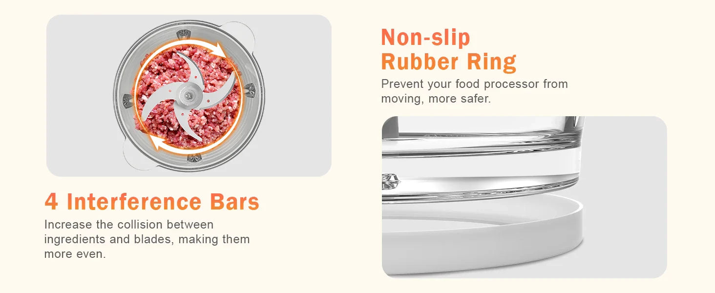 2L Large Capacity Bowl & 2 blades : The two 2L (8 Cup) large capacity bowls and 2 S shaped 2-layer stainless steel blades make you handle both foods at the same time and without mixed flavor neither. The highly transparent glass bowl allows you to visualize food grinding. Thick stainless steel bowl, more resistant to falling and wear. Two large bowl of this food processor chopper allows for the processing of a large amount of food at one time, making it convenient for larger meal preparations