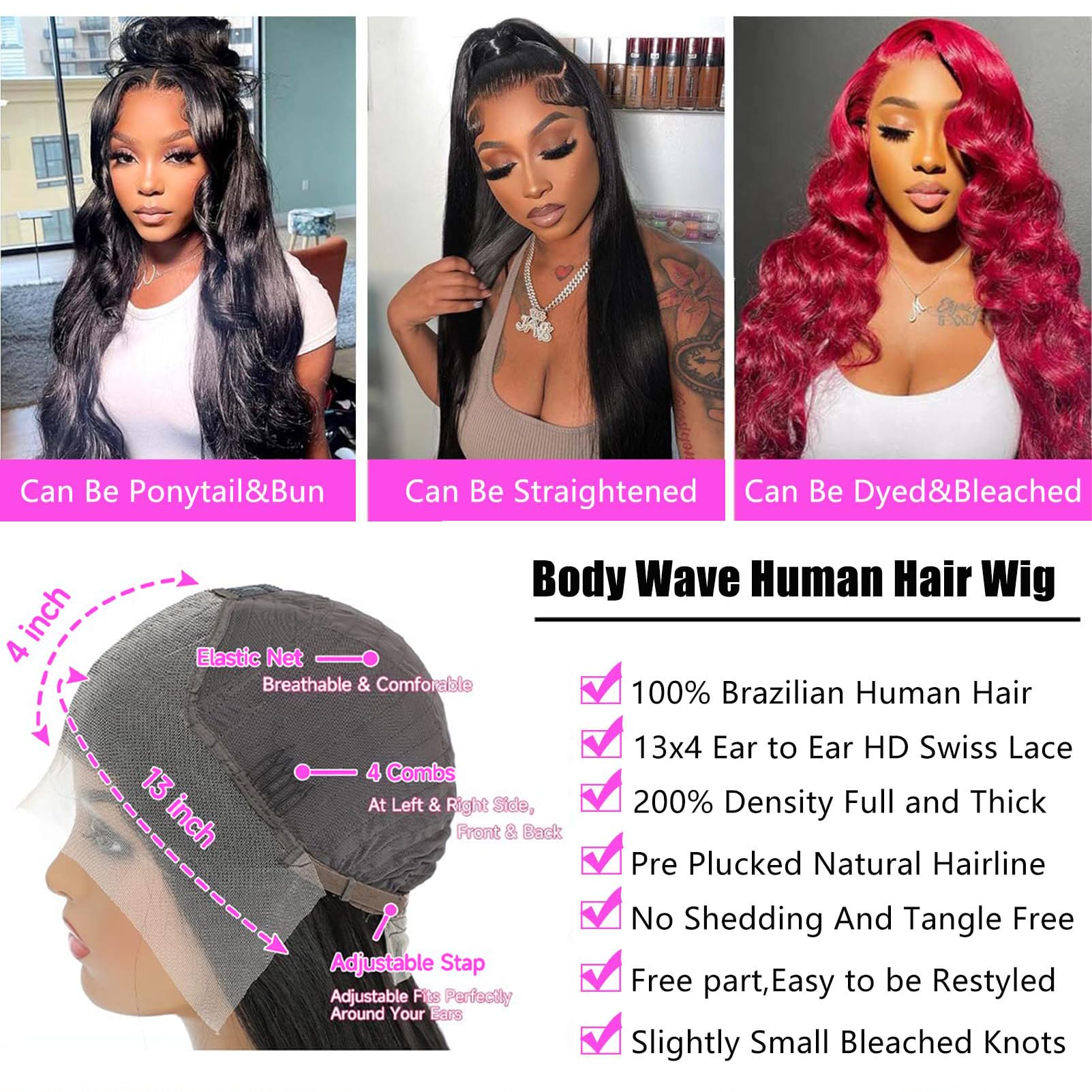 - 13x4 LACE FRONTAL WIGS HUAMN HAIR CAP: Glueless human hair wig is medium cap size (22.5inch), 4 combs and adjustable strap, easy to install and adjust, breathable and comfortable, suitable for all black women