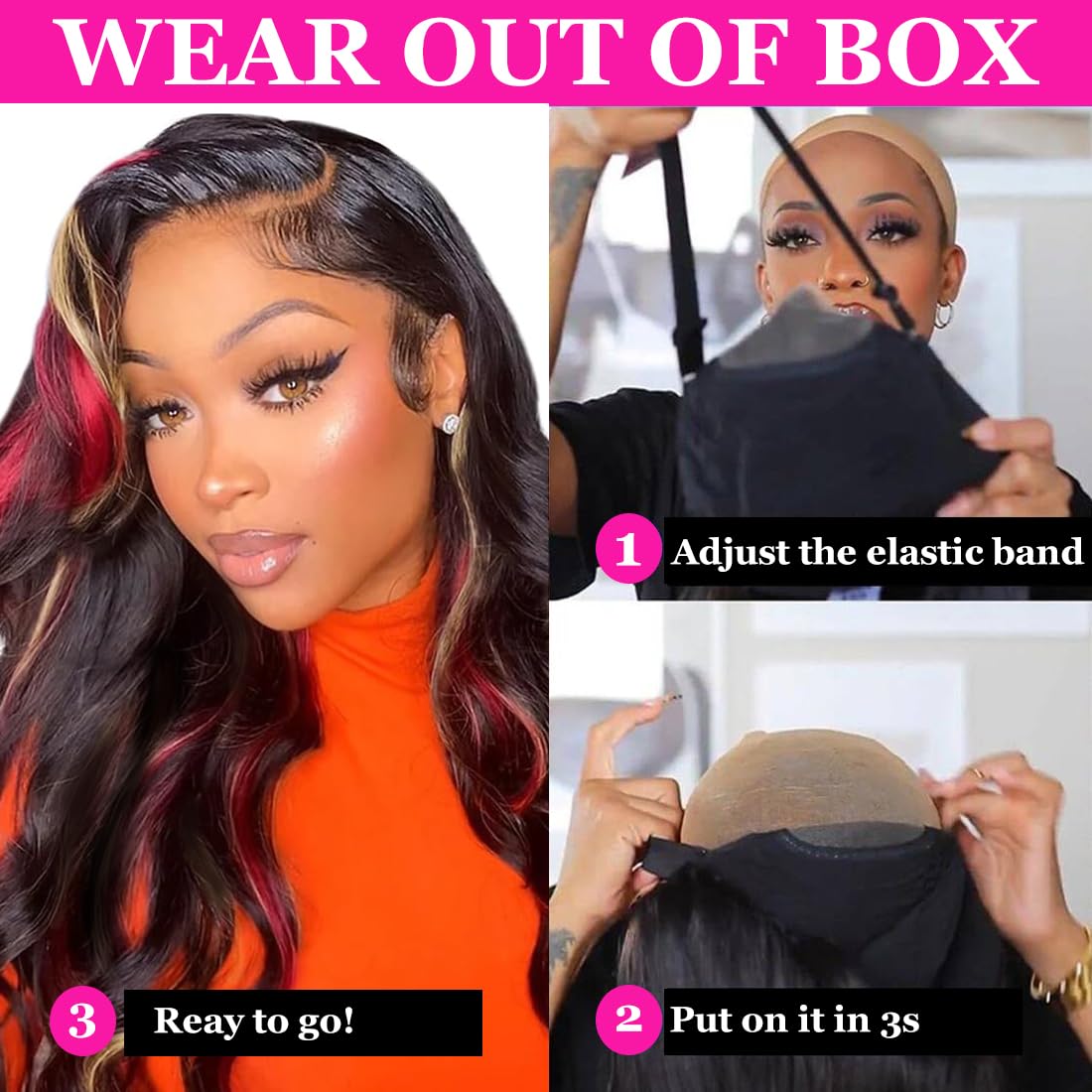 - Black Red and Blonde Highlight Wig:Human Hair Wig,Lace Front Wigs Human Hair,Glueless Wigs Human Hair Pre Plucked Pre Cut,13x6 Lace Front Wigs Human Hair,Red Lace Front wigs human hair,13x6 Lace Front Wigs Human Hair 200 Density, Body Wave Wig From Unprocessed Young Girl's Hair,Has Soft Texture and Elastic,No Chemicals and Pungent Smell,No Harm to Health, The Wig Looks Natural, Just Like Your Own Hair.