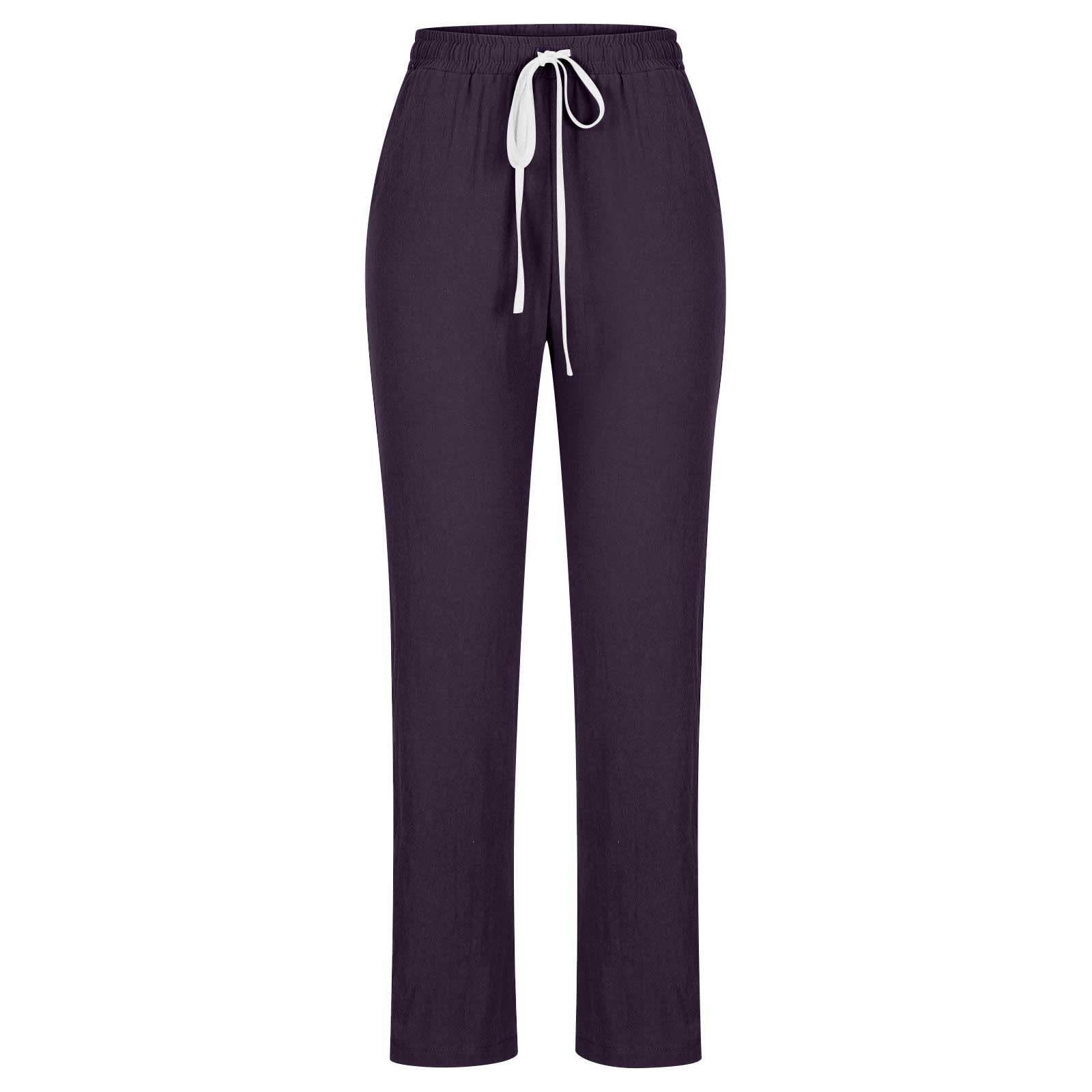 2024 Linen Pants Women Straight Leg Pants Summer Casual Drawstring High Waisted Cotton Loose Trousers with Pockets Purple