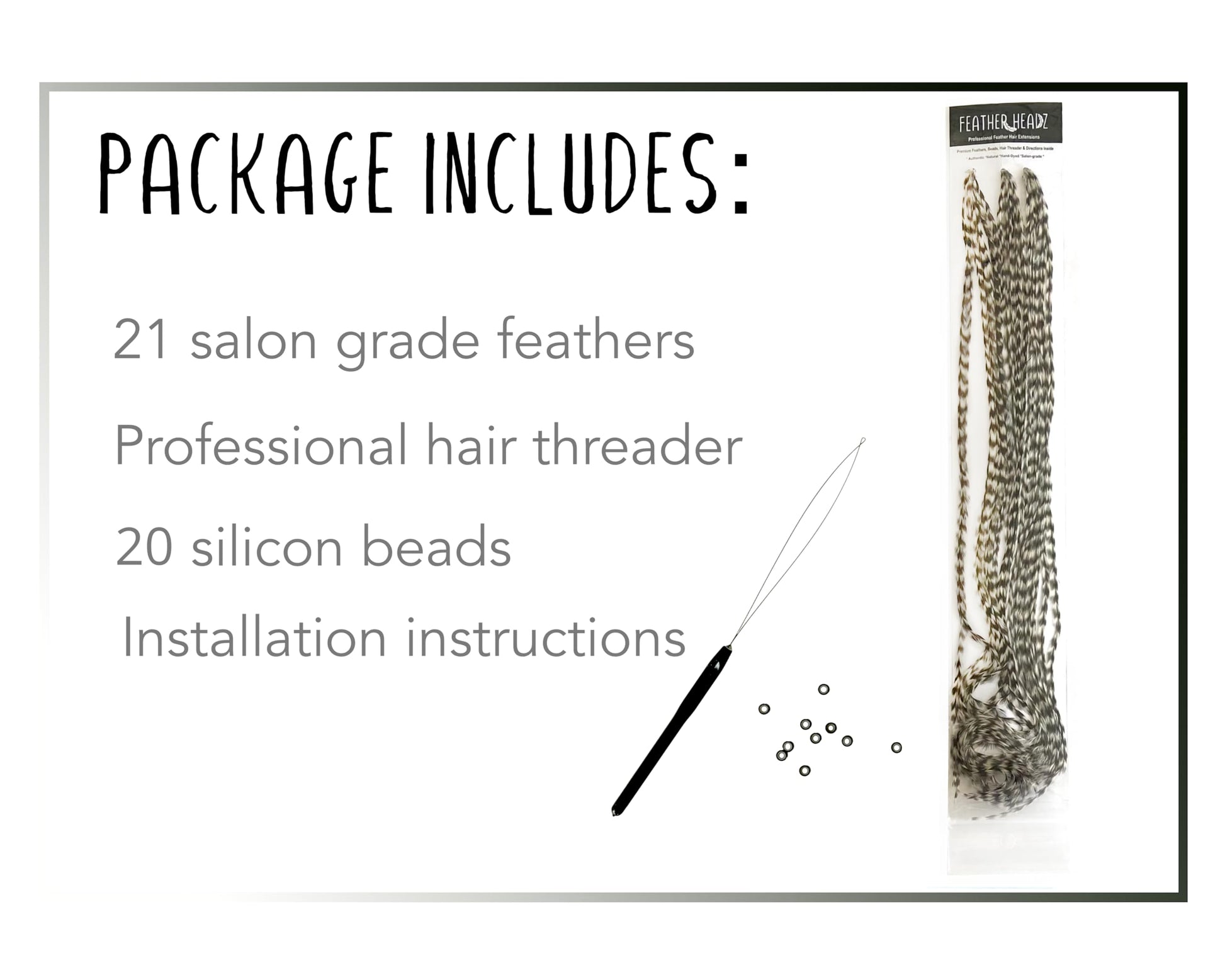 21 Grizzly Color Hair Feathers - 9”- 14” Long - Feathers for Hair Extension, Hair Extension DIY Kit - Eye-Catching Design - 20 Micro-link Beads - 100% Real Rooster Feathers