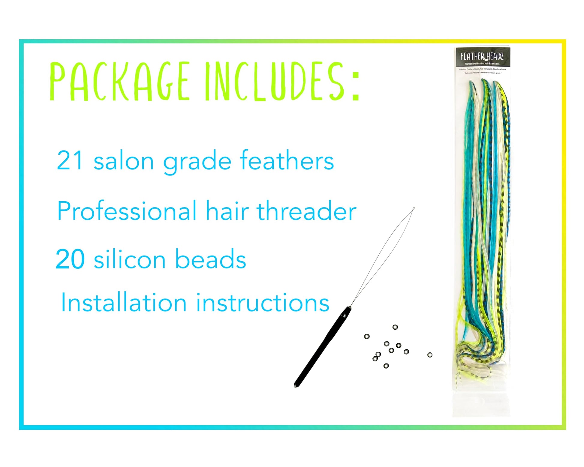 21 Neon Green & Turquoise Color Hair Feathers - 9”- 14” Long - Feathers for Hair Extension, Hair Extension DIY Kit - Eye-Catching Design - 20 Micro-link Beads - 100% Real Rooster Feathers
