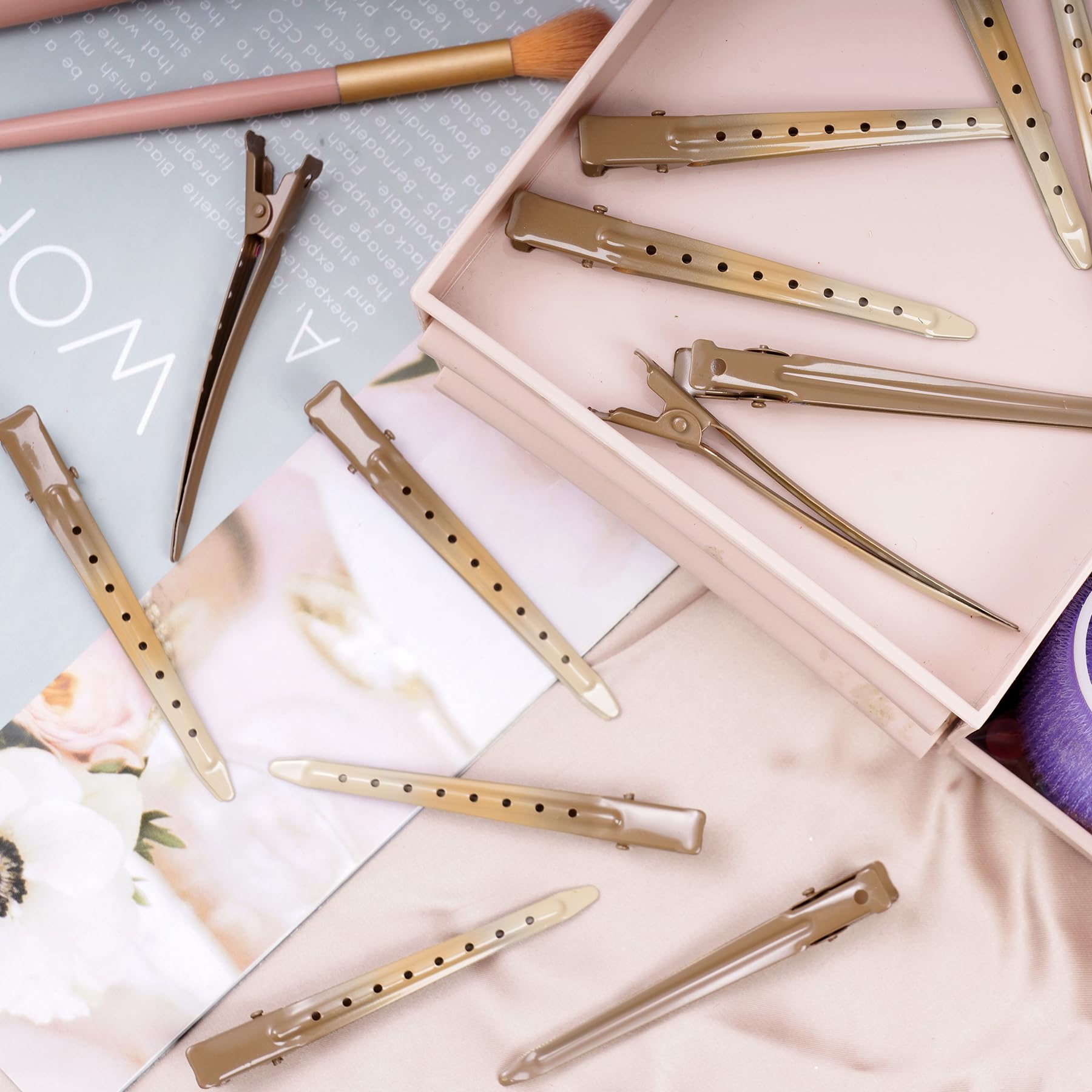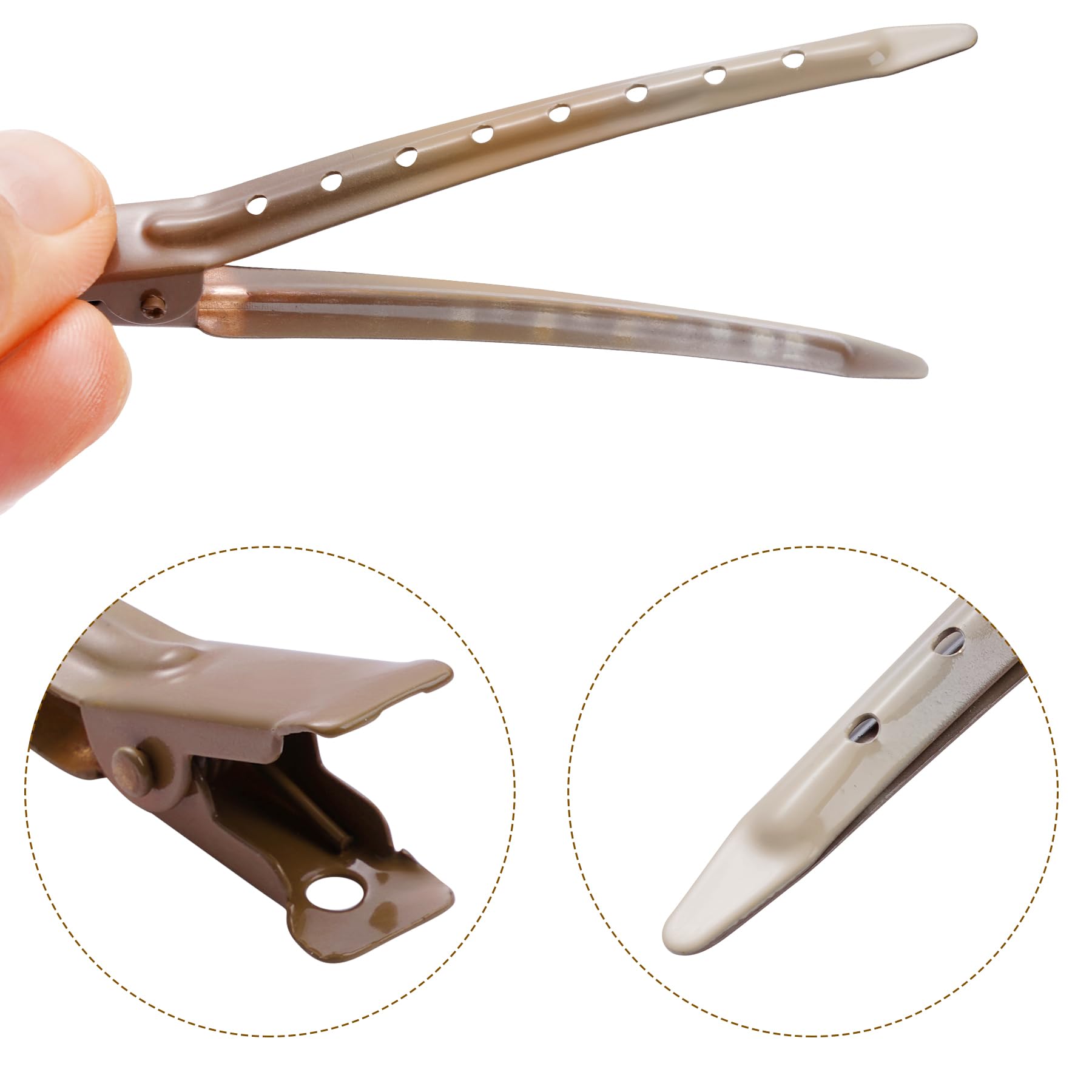 24 Packs Duck Bill Clips, Bantoye 3.35 Inches Rustproof Metal Alligator Curl Clips with Holes for Hair Styling, Hair Coloring, GS Brown
