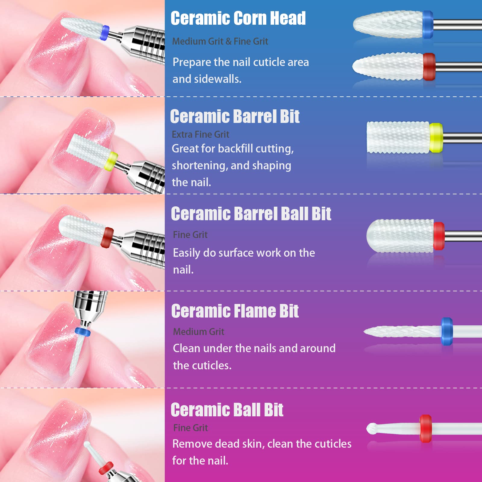 - [Experience Superior Quality at an Affordable Price] Crafted with precision and made from superior materials, our rainbow diamond carbide bits offer exceptional strength, while our ceramic bits provide excellent heat dissipation for effortless removal of hard gel nails. With proper care, these long-lasting bits will serve you well. Elevate your nail care routine with our high-quality nail bits