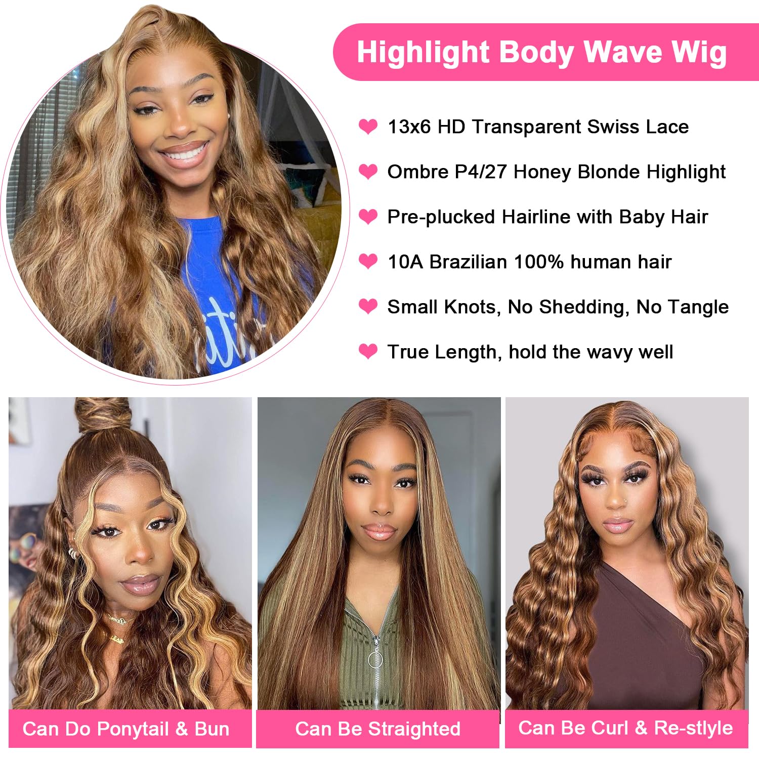 28 Inch Highlight Lace Front Wig Human Hair Ombre Lace Front Wig Human Hair Wigs for Women 13x6 Body Wave Lace Front Wigs Human Hair Honey Blonde HD Lace Front Wig Human Hair with Baby Hairline