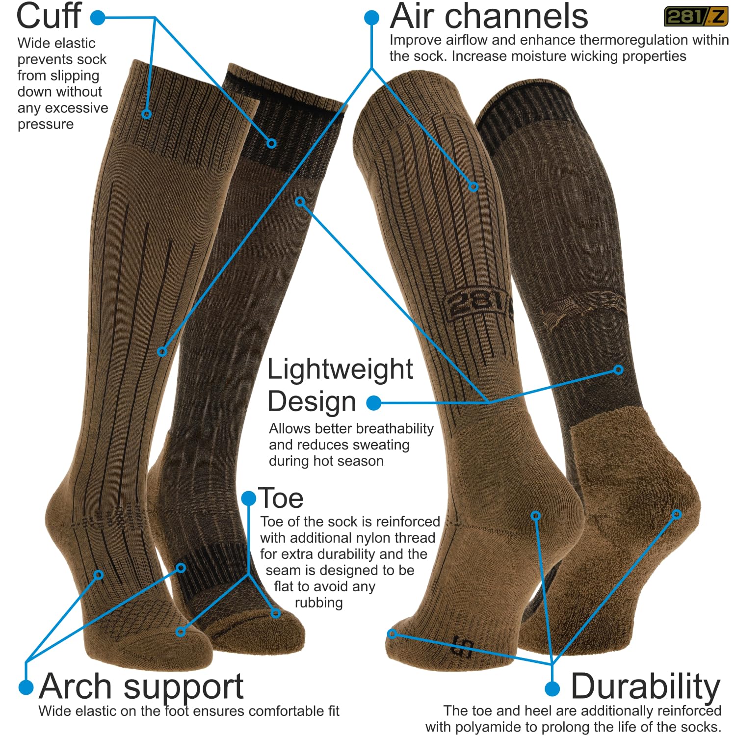 - VERSATILITY. Socks are designed for continuous use with demi-season and summer military boots, mountaineering boots, hiking boots, working footwear and another types of professional footwear.