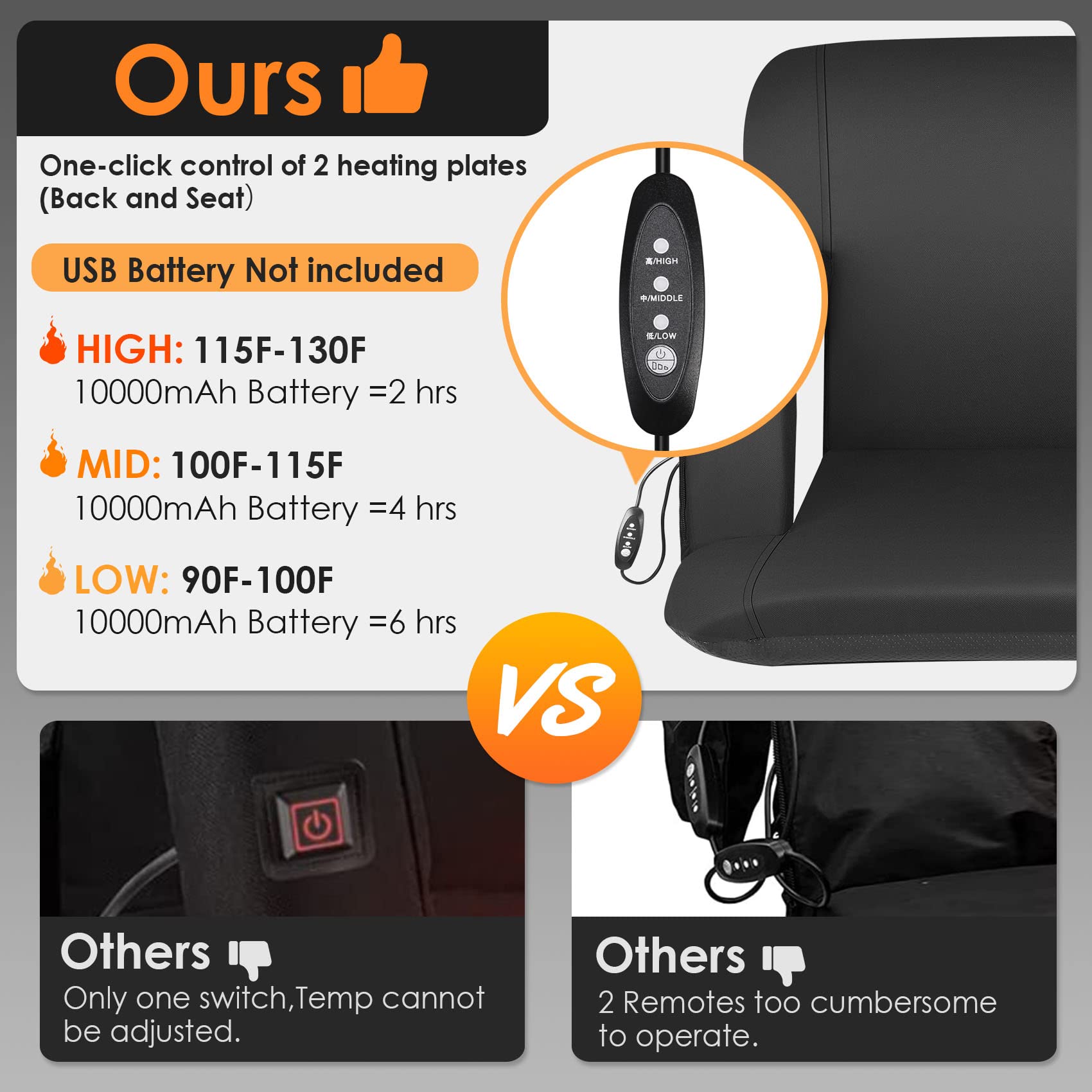 Details: Description Double Heated Stadium Seats for Bleachers with Back Support and 21' Wide Cushion, Extra Portable Bleacher Seat Foldable Stadium Chair, 3 Levels of Heat, 5 Pockets for Outdoor Camping Games Sports You can get a 21' bleacher seat with armrests down and a comfortable 16' stadium chair with armrests up. The double heated stadium seats is heated by USB power supply and can be used with any USB battery for several hours. 3 levels control the heating temperature: High, Medium and Low. The heated folding chair can be heated to a maximum of 130 °F This bleacher seats with backs and cushion wide is made of waterproof polyester and durable Oxford cloth. A layer of PVC leather with raised particles is added at the bottom of the stadium seats, which is waterproof, non slip and easy to clean. Stadium seats for bleachers with back support has 6 adjustable tilt angles to choose the most comfortable one. This heated portable chair has five hidden pockets. Inside the hidden zipper of the armrest on both sides of the seat. And a huge pocket on the back of the backrest. Conveniently store your personal items, such as snacks, sunglasses, water cups, mobile phones, etc. Package Included: 1x 21' heated stadium chair 1x user guide Note: USB power bank not included.NOTE:The spring hook is hidden inside the bottom zipper.We recommend using power supply above 10W.