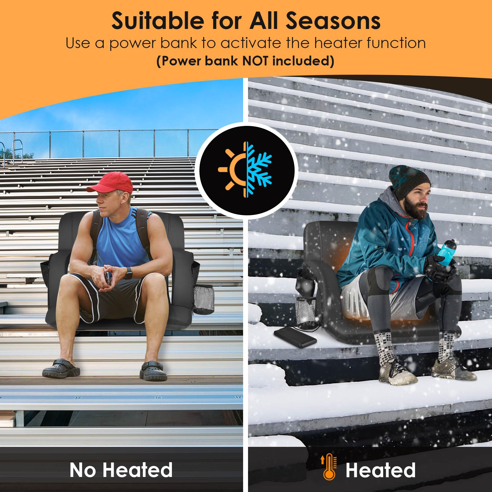 - This stadium seats for bleachers with back support with heat function.So it doesn't matter whether it's summer or winter.It can be used in all year around.This seat is heated by any USB battery for several hours. 3 levels control the heating temp: High, Medium and Low. The heated folding chair can be heated to a max of 130 °F.(Note: USB power bank not included.) We recommend using power supply above 10W.
