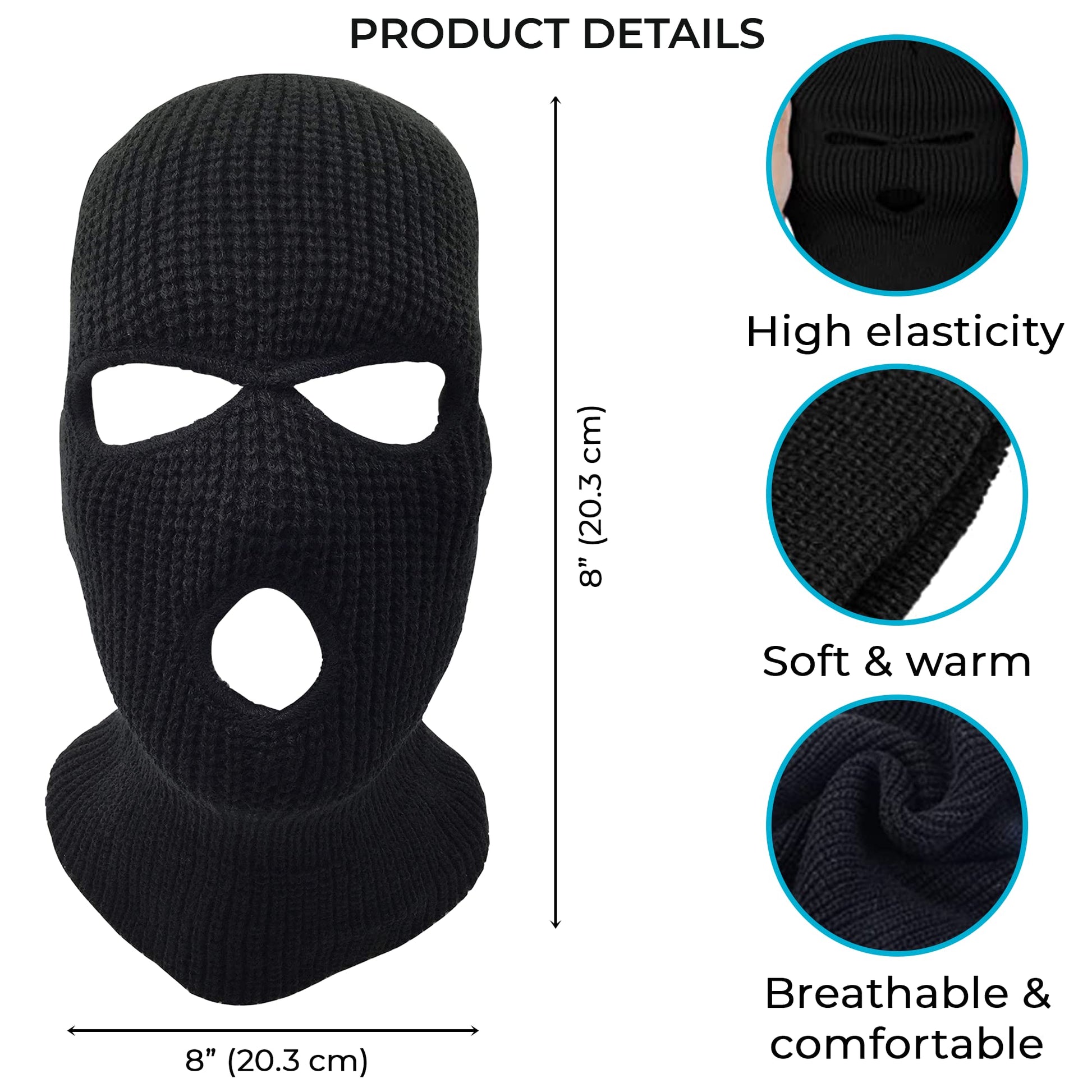 Fully Covers Face - Double Layered and Thick. One Size Fits Most - Made of Knitted Stretchy Material - Perfect for both Men and Women. Strong Stitching Around Eyes and Mouth - Another layer of stitching is added around the eyes and mouth for durability. 3 Holes - 2 for the eyes, one for the mouth. Wear as a Beanie - Going indoors? No problem. Fold it up and Wear as a Beanie! Comfortable Fit for Many Activities - Wear them When: Skiing, Motorcycling, Running, Trekking, Hiking, Mountain Climbing, Snowboarding, Airsoft, Painball, Tactical Training, Cycling, and Much More!
