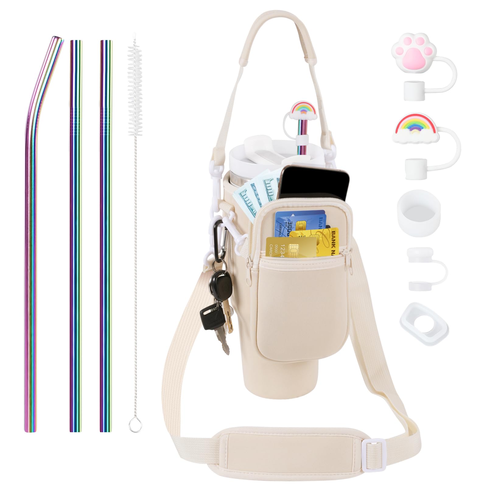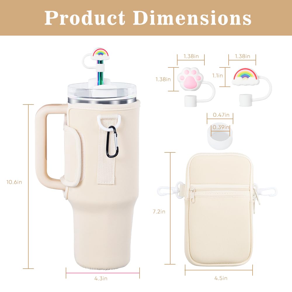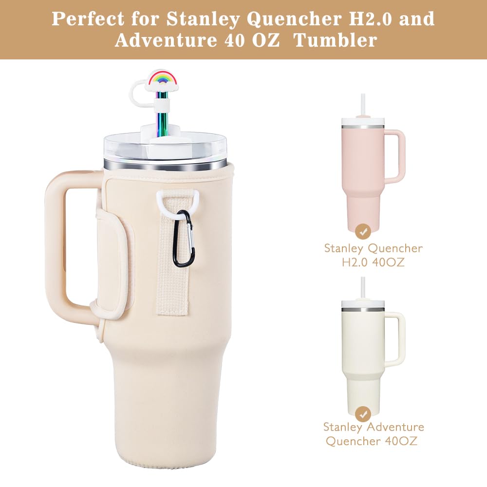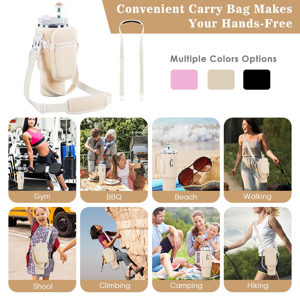 3 in 1 Water Bottle Carrier Bag with Pouch Pocket fits Stanley 40 oz Tumbler, Water Bottle Holder with Strap for Stanley Cup Accessories with Stainless Steel Straws, Straw Cover, Spill Proof Stoppers