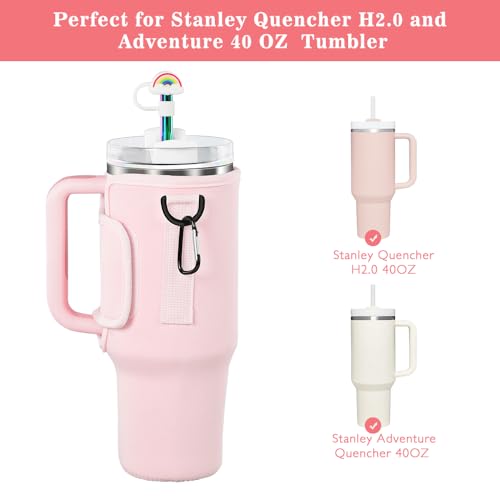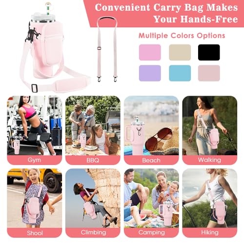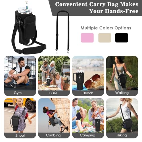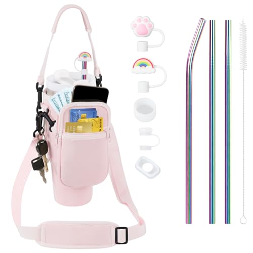 3 in 1 Water Bottle Carrier Bag with Pouch Pocket fits Stanley 40 oz Tumbler, Water Bottle Holder with Strap for Stanley Cup Accessories with Stainless Steel Straws, Straw Cover, Spill Proof Stoppers