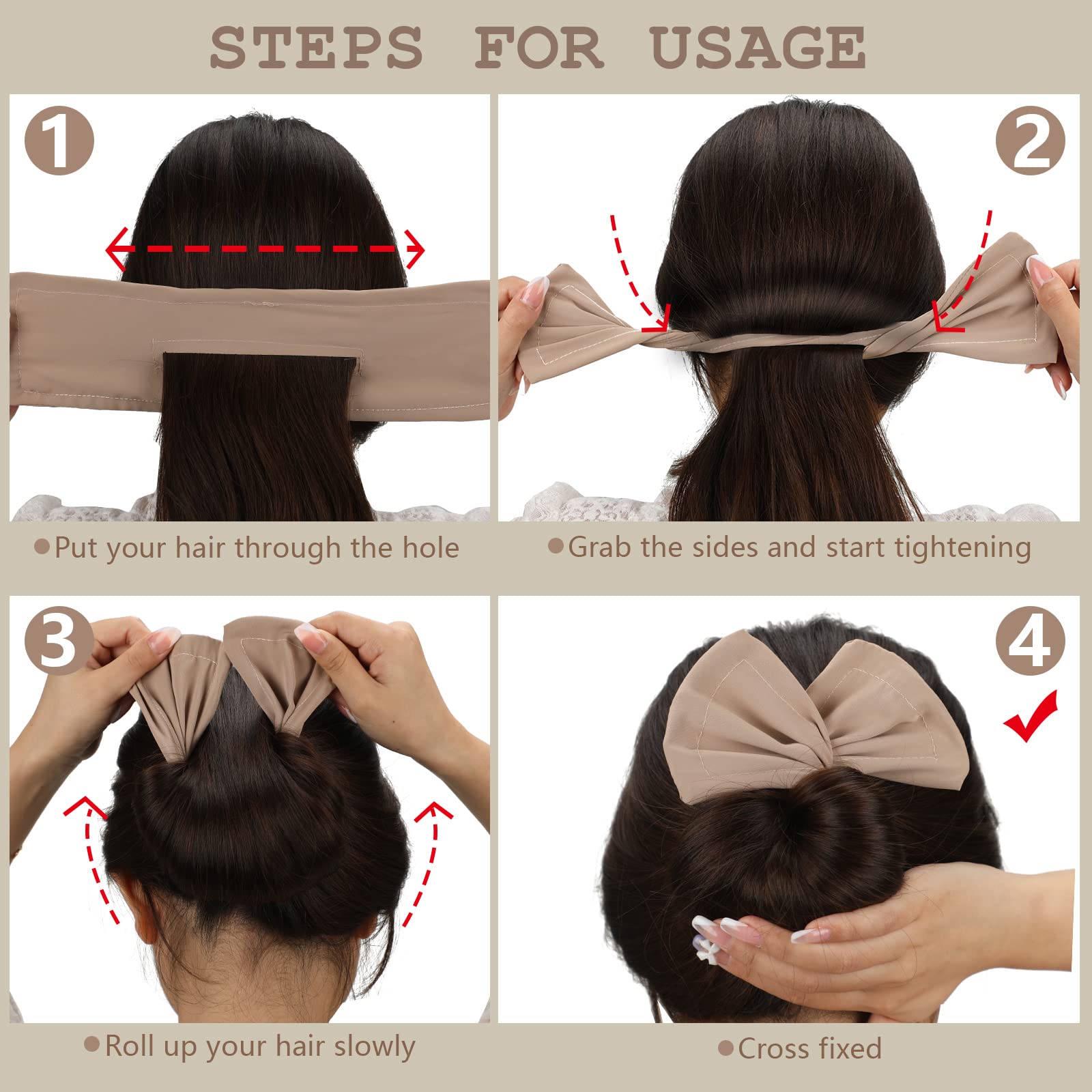 - Easy to apply: the reusable bun crown twisters are convenient for you to use, specifically, firstly, you need to run your ponytail through the center hole, then grab the 2 ends of the hair twister and twist it down once or twice to tighten your hair, finally roll the 2 ends of the hair twister around your ponytail and tie a bow