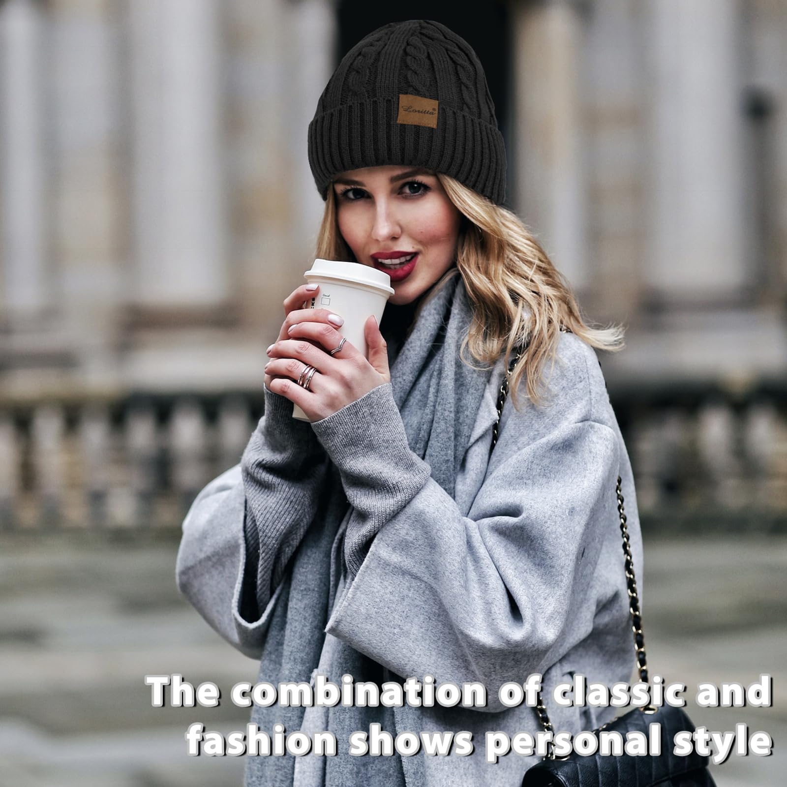 3 Pieces Womens Beanie Hat Scarf Touch Screen Gloves Set for Women Warm Knit Fleece Lined Skull Caps Neck Warmer Gifts,A-Black