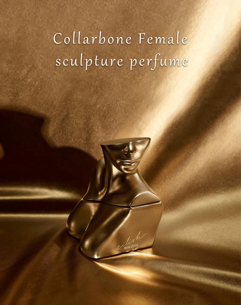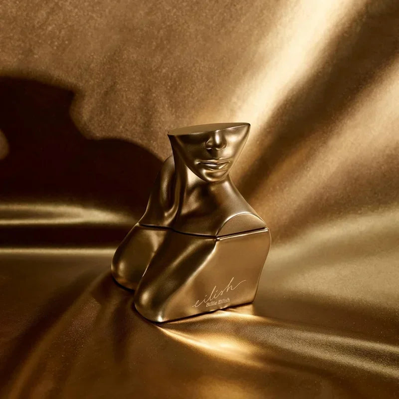 The bottle is inspired by Billie's favorite parts of the body: the chest, neck, and collarbone, and is gilded in beautiful amber-bronze. It is a fusion of angles and soft curves, inspired by elements from classic sculptures and the human form.