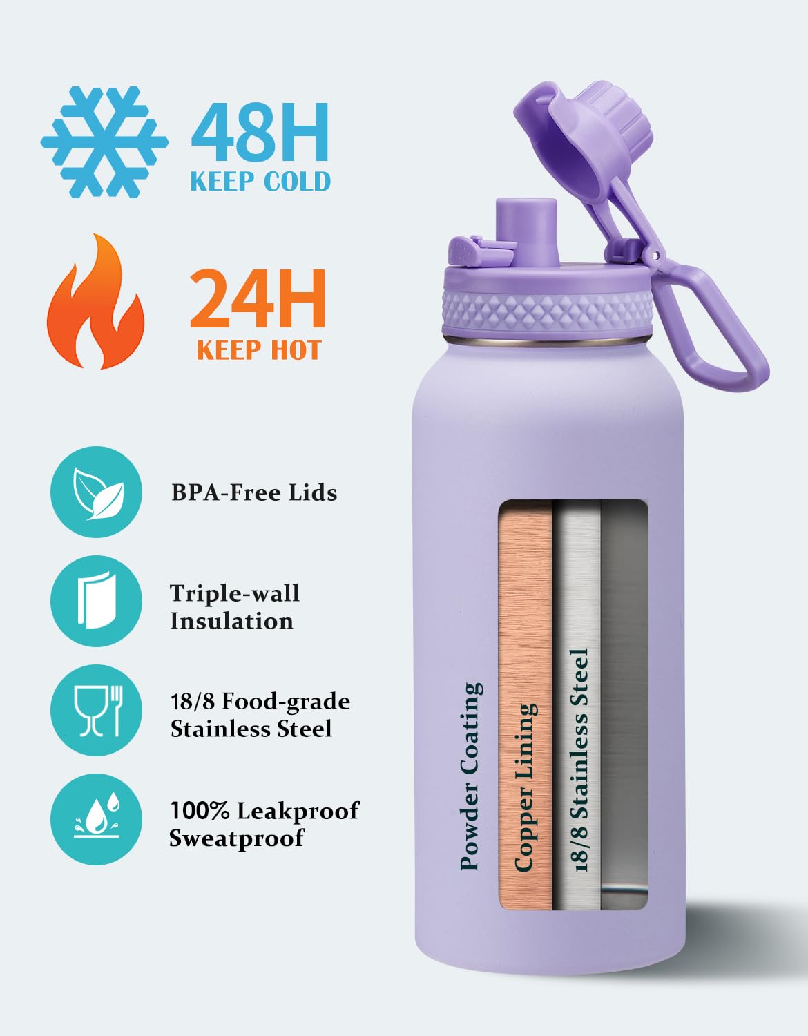 - TRIPLE-INSULATION & HIGH-PERFORMANCE - VICKNIY metal water bottle 32 ounce is made of food-grade 18/8 stainless steel and features a vacuum insulated triple wall design that keeps your beverage at the perfect temperature all day long (Cold 48H & Hot 24H)! The wide mouth water bottle makes it easy to fill with water and ice, while the anti-slip powder coating ensures a firm grip, and the sweat-proof design to keep your hands dry, no more messy using