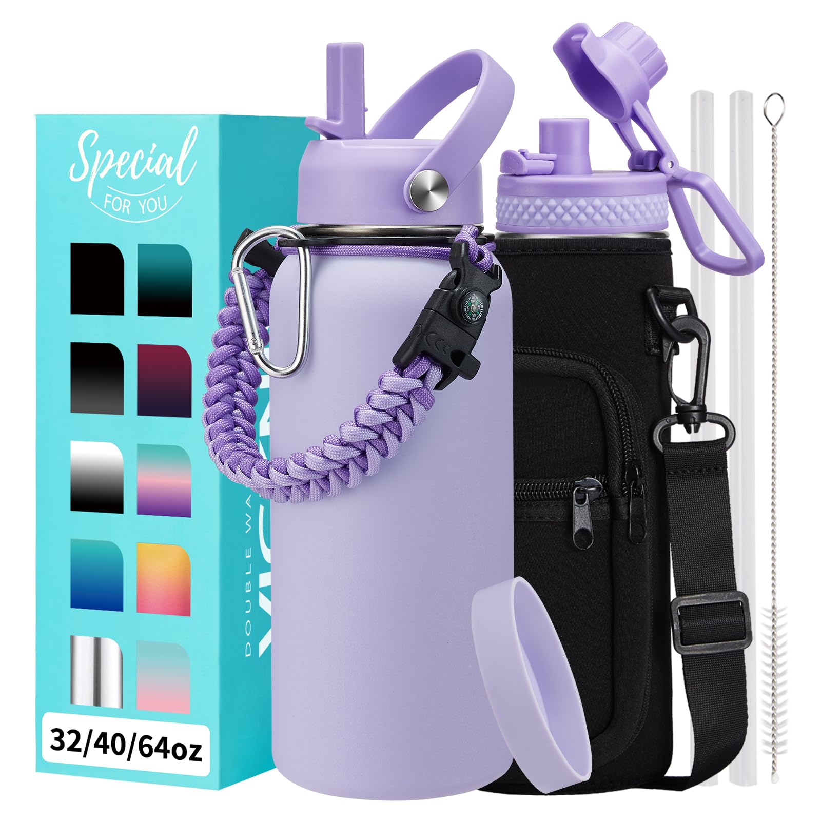 - SUPER DEAL COMBO - Buy one 32 oz insulated water bottles, get 9 accessories: 1 x straw lid, 1x Auto Chug lid, 1 x paracord handle, 2 x straws(BPA Free), 1 x carrier bag, 1 x shoulder strap, 1 x protective silicone boot, 1 x straw brush. The 32oz insulated water flask perfect to keep you stay hydrated throughout the day