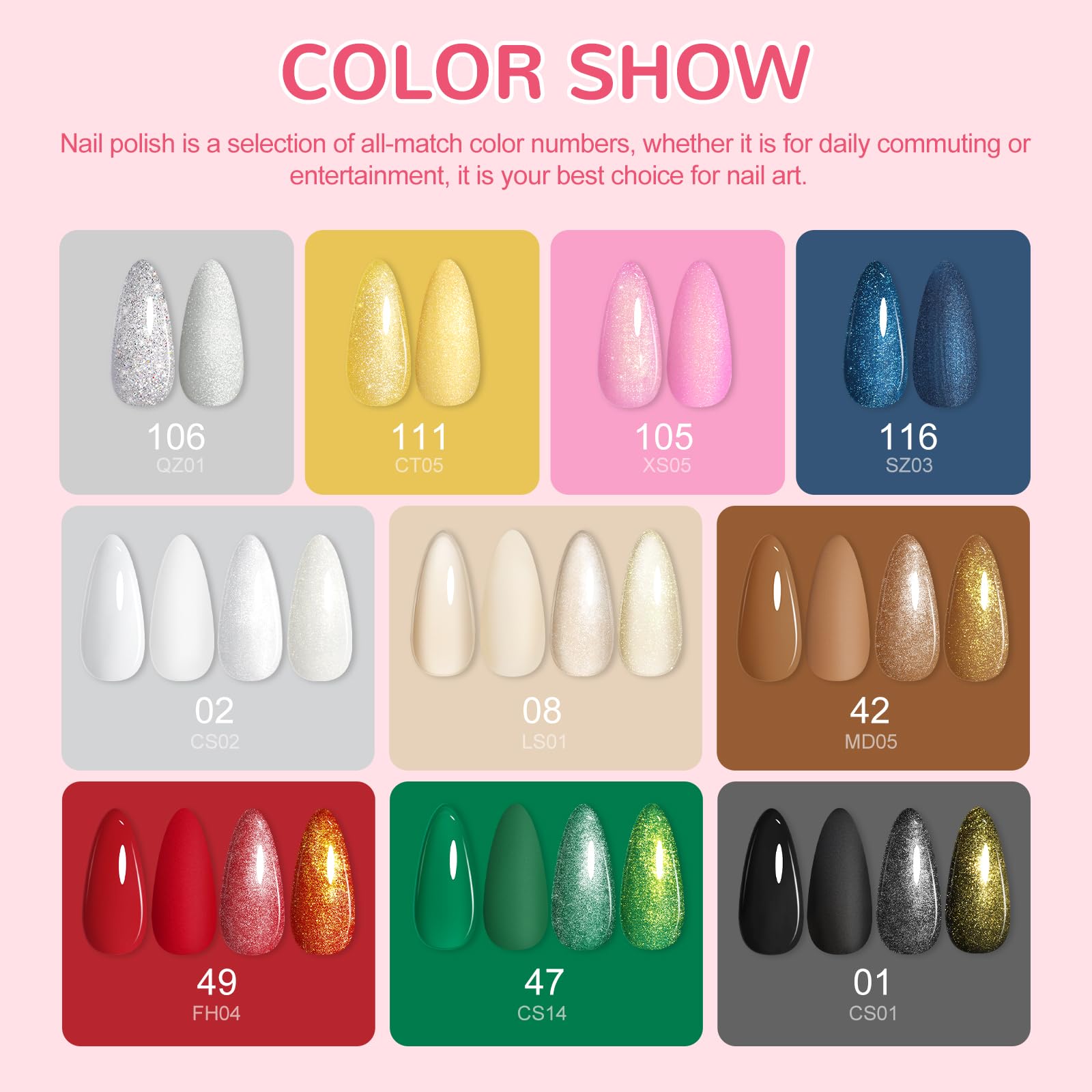 - 【4-in-1 Effects:Matte&Glossy& Silver Glitter&Gold Glitter】Our gel nail kit comes with 5pcs matte/glossy/glitter top coat and base coat, can making 4 different effect nails:matte ,glossy,silver glitter,golden glitter.With this kit, you can transform a single gel color into four distinct styles! Whether you prefer a sleek matte finish, a high-shine gloss, or a dazzling sparkle, each style is unique yet equally stunning.