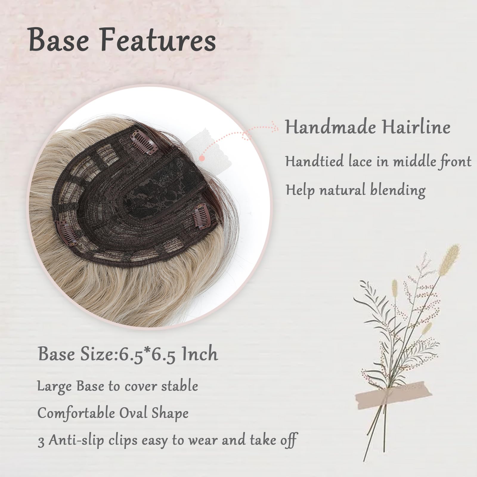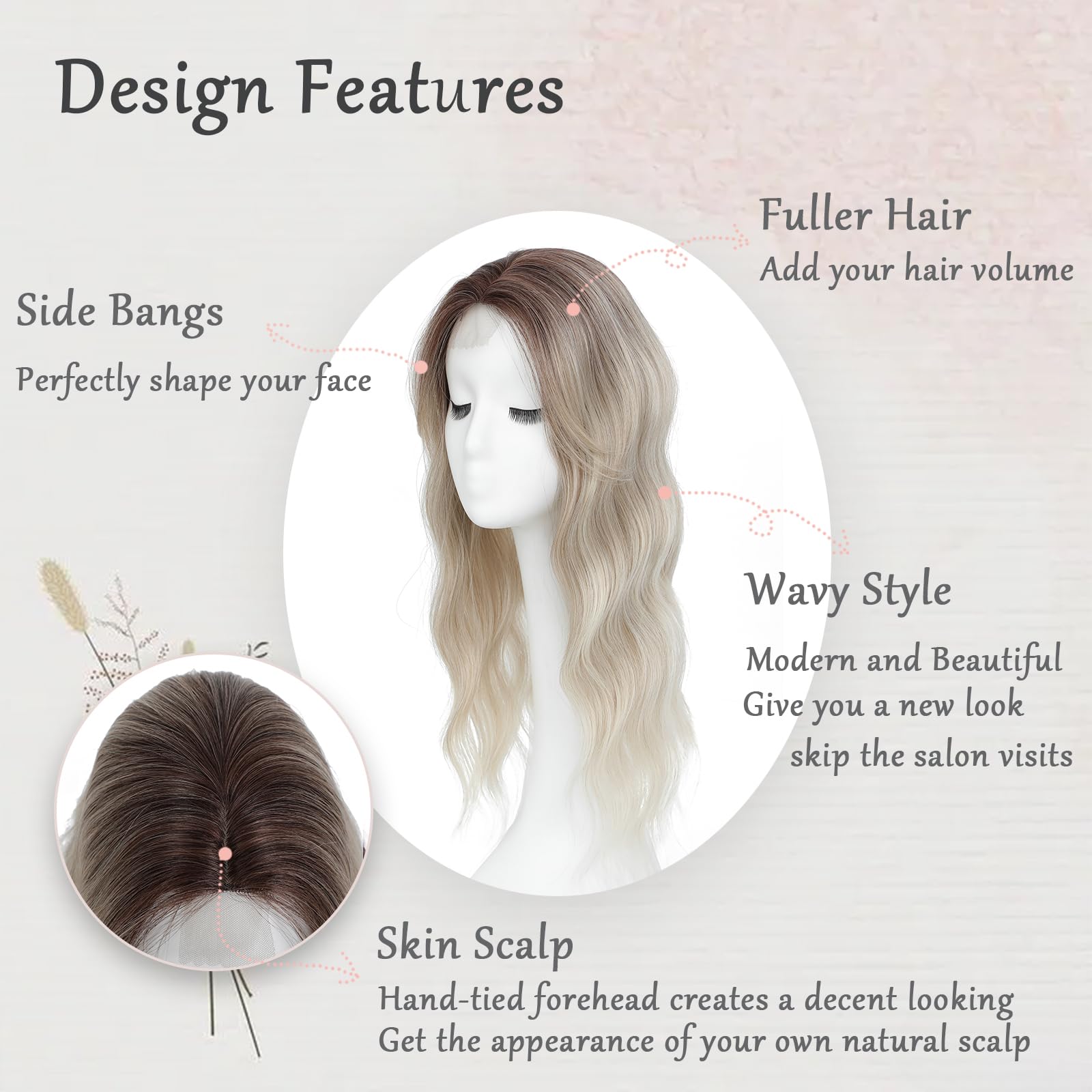 360 3D Wiglet for Women: 20 Inch Curly Hair Topper with Side Bangs, Wavy Hair with Thinning, Ash Blonde Mix Highlights with Brown Root