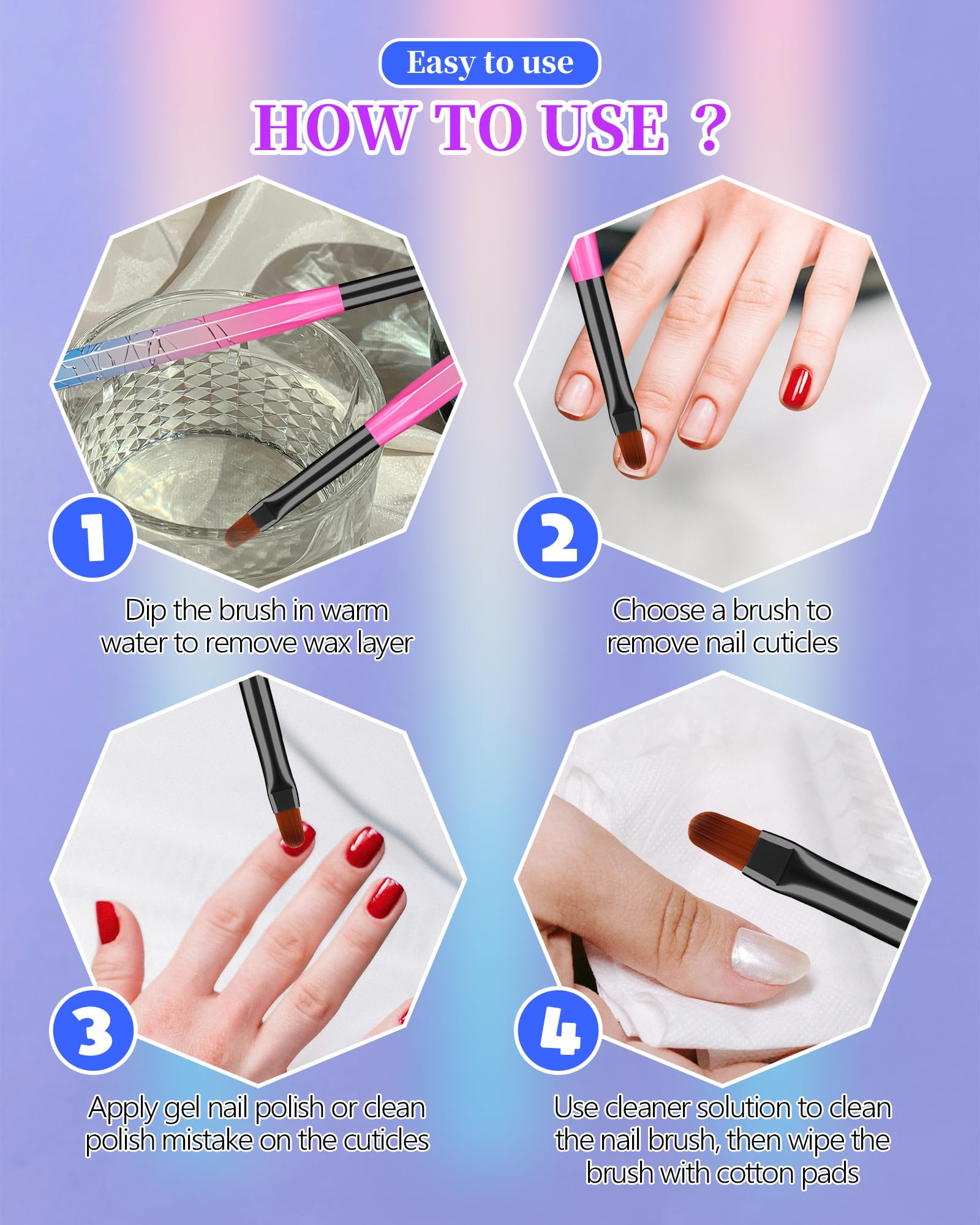 - Convenient to Use and Clean: Dip the brush in nail polish remover and gently remove excess polish around the cuticle. The premium soft bristles clean easily with a non-acetone remover. Clean after each use to maintain peak condition