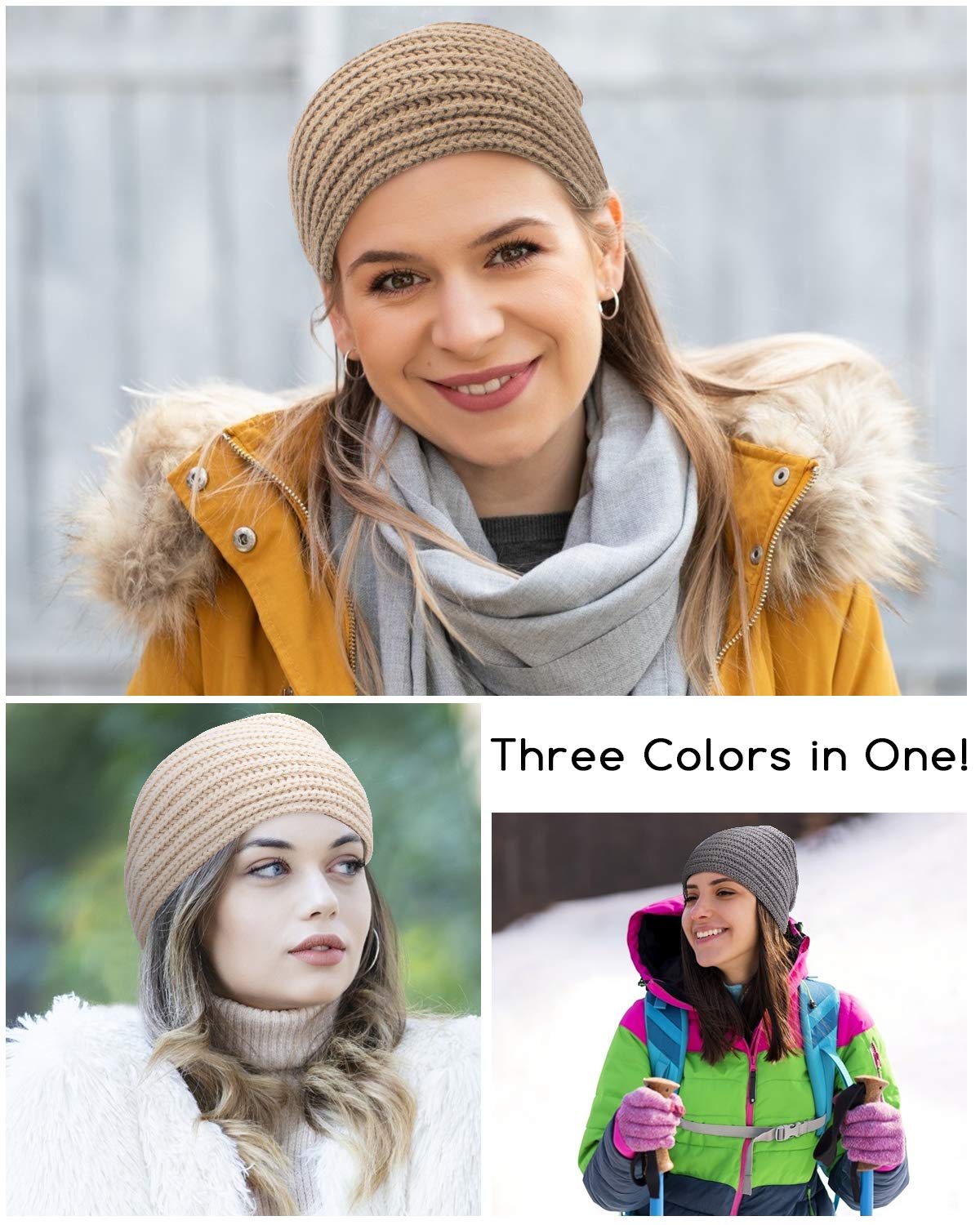 3pcs Womens Winter Hats, Beanie Hat for Women, Knit Hat Slouchy Beanies Wool Hat, Warm Turban Hat Thick Chemo Caps for Cancer Patient, White Gray Brown