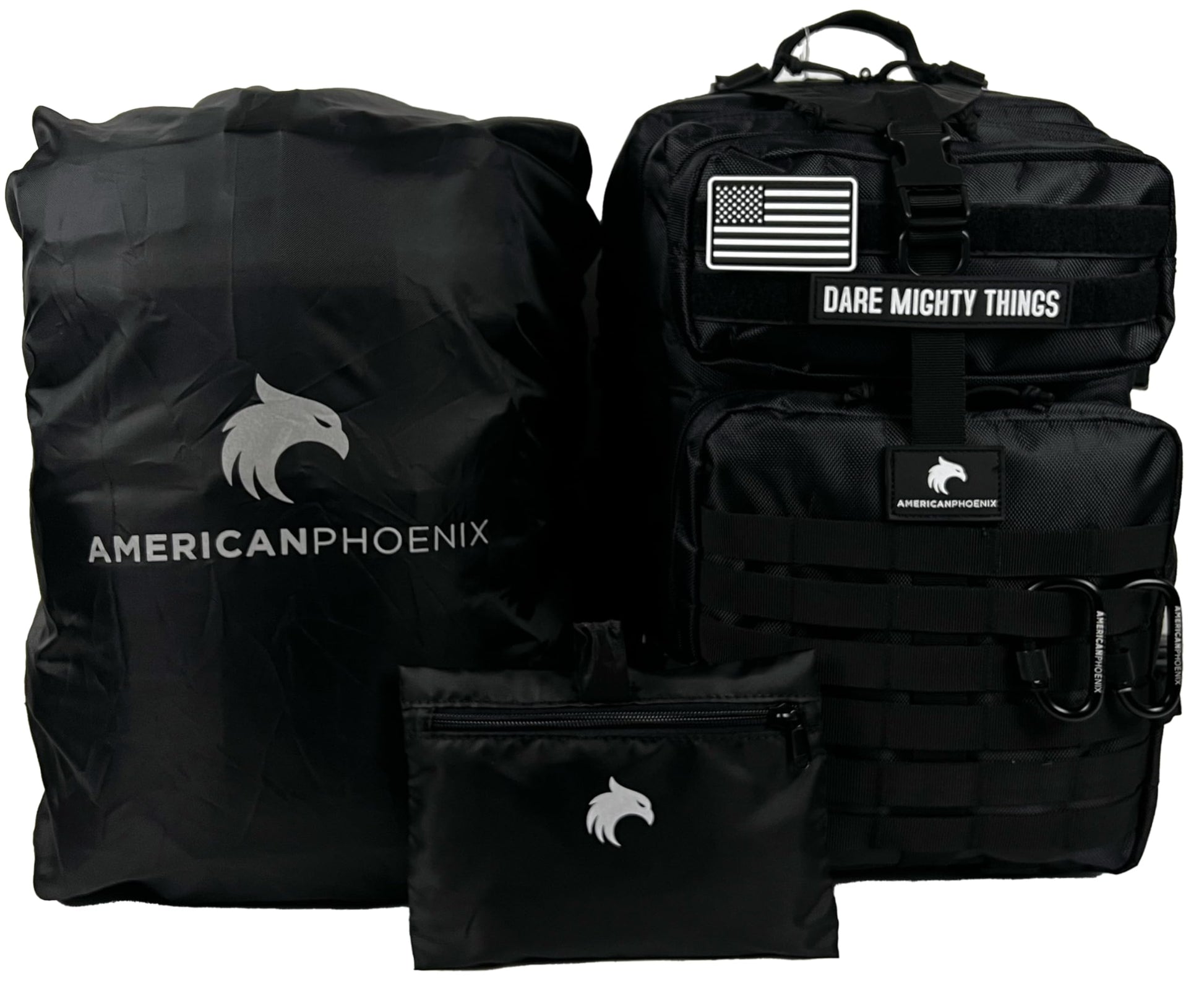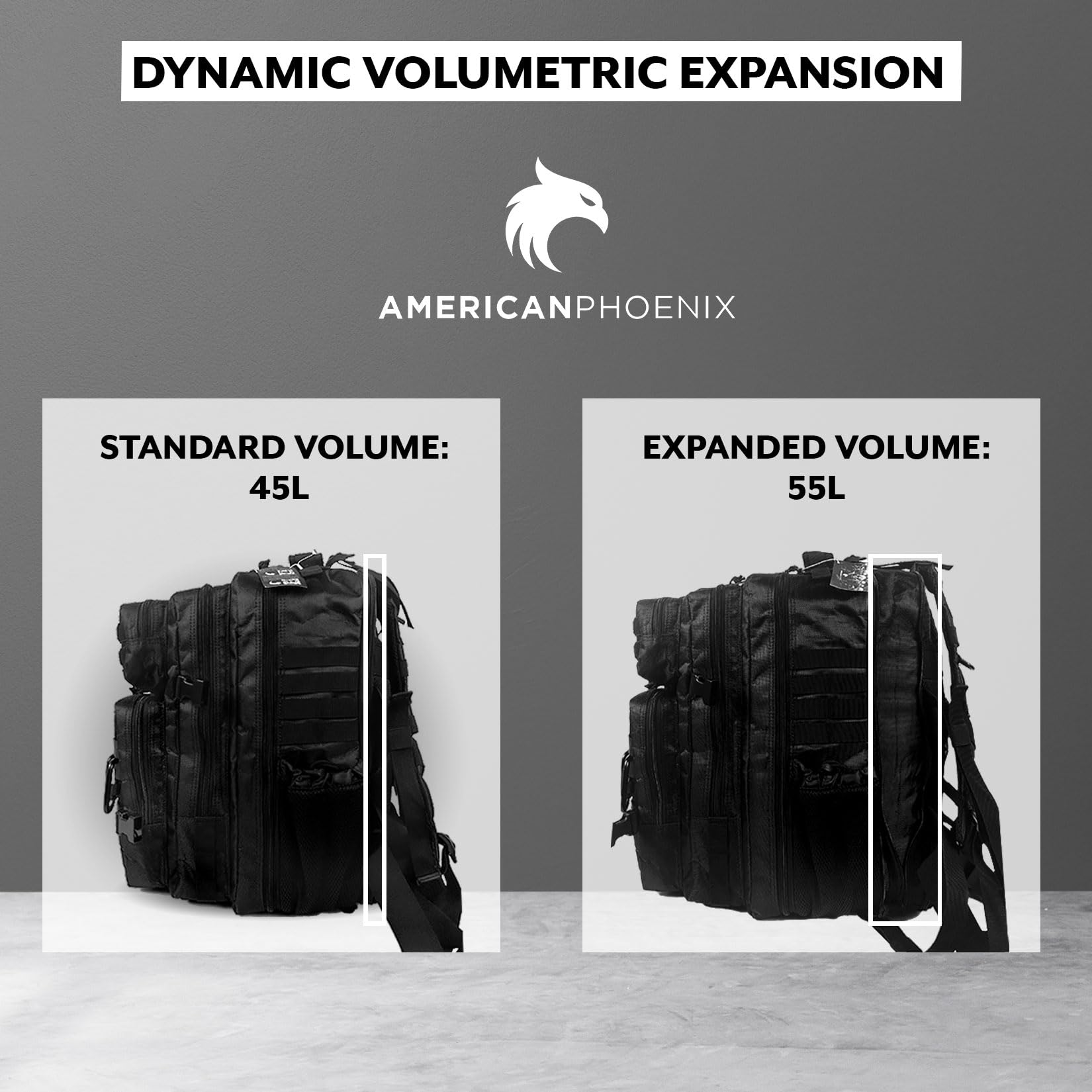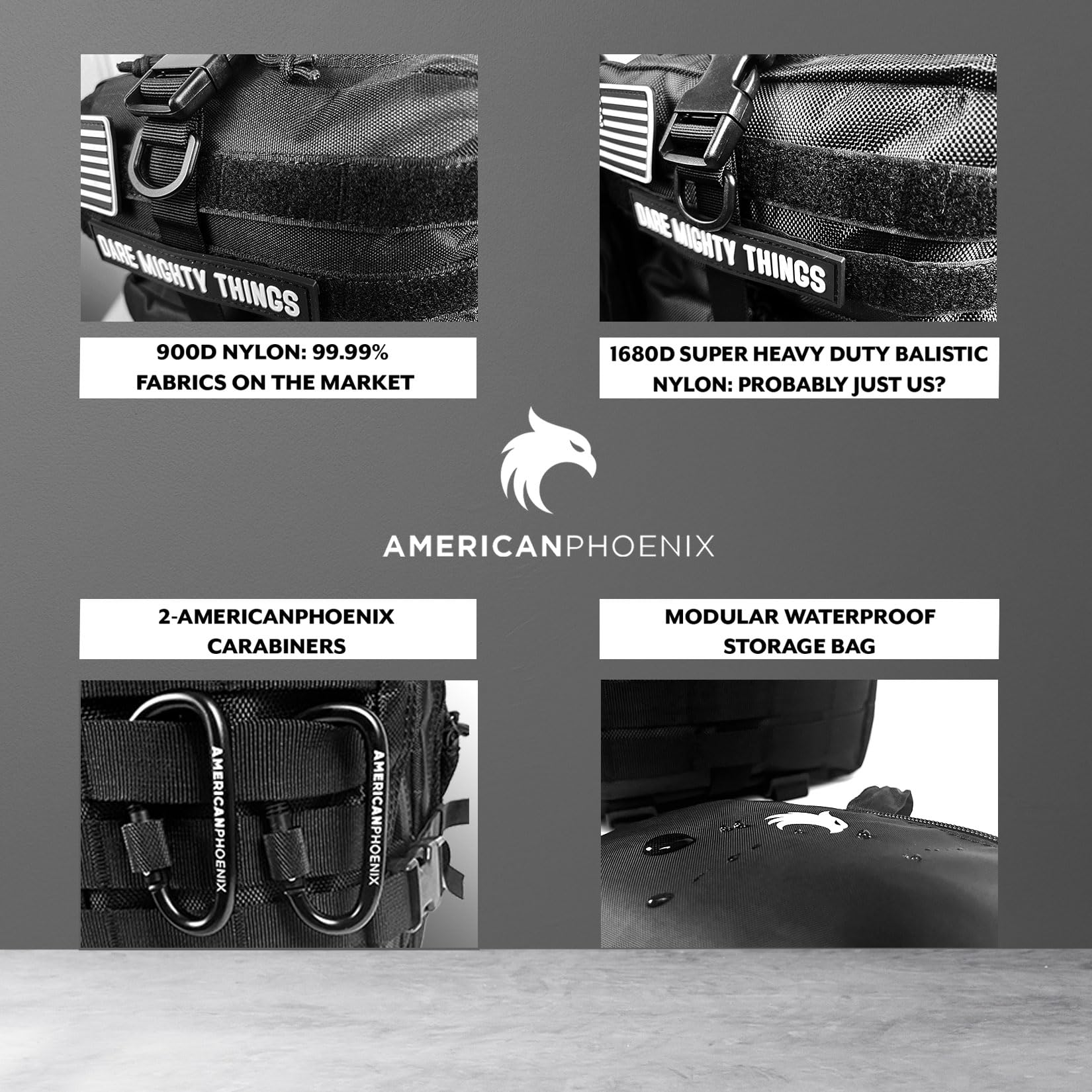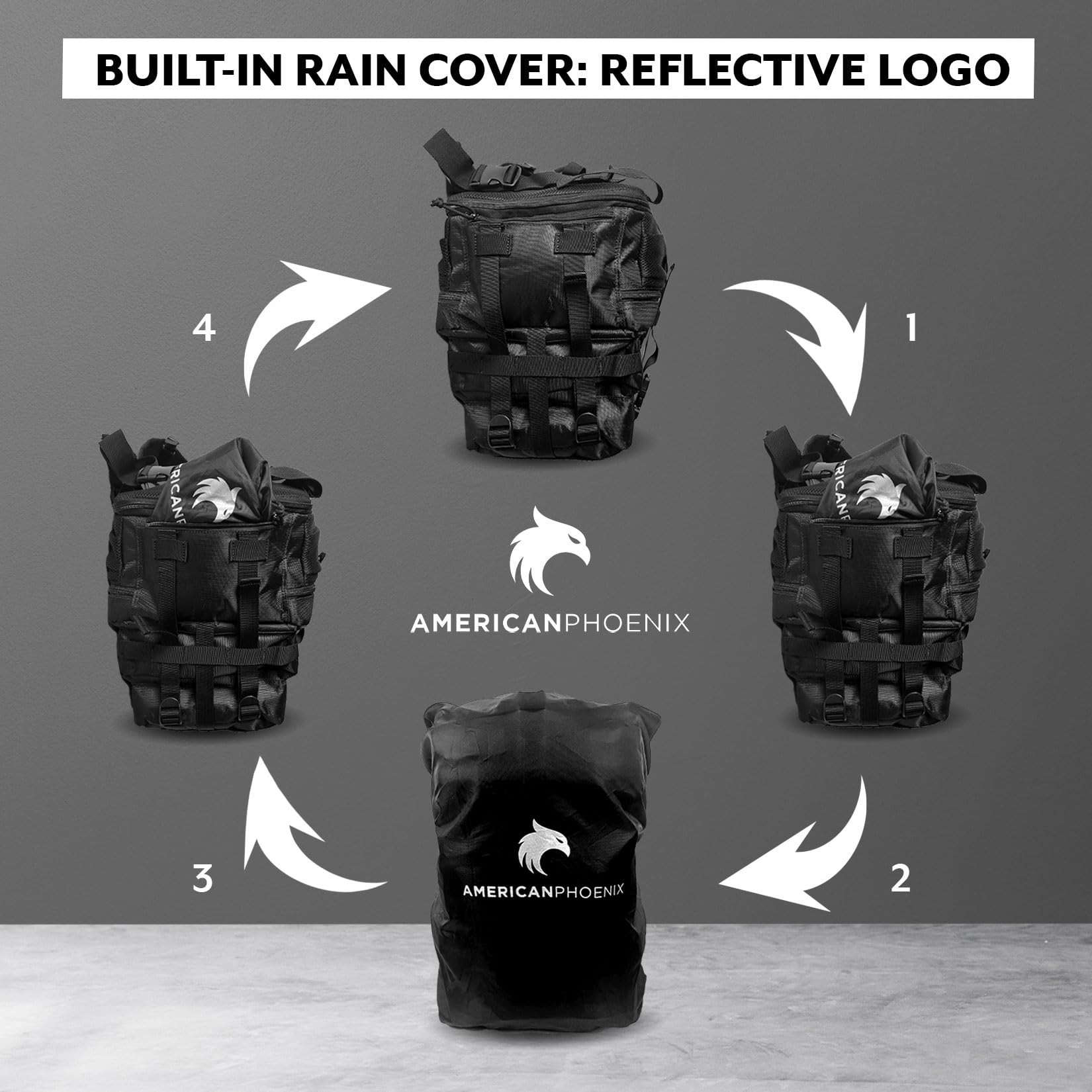 - โก BUILT-IN MODULAR RAIN COVER: Located at the bottom of the bag, we have built-in a reflective AMERICANPHOENIX branded rain cover. The modularity of our design allows versetile functionality of the bottom pocket storage space. It's an ideal choice for those seeking a professional tactical backpack, survival backpack or camping companion.