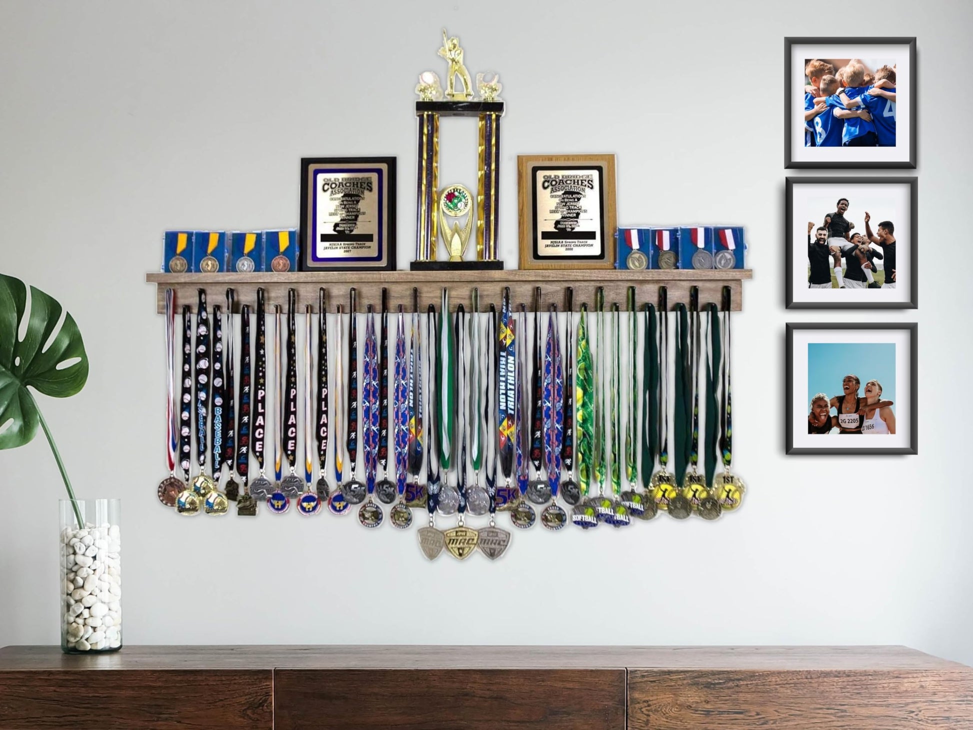 - DISPLAYS YOUR ACHIEVEMENTS β Share memories and organize your accolades with our modern, space-saving medal & trophy display rack! Made from 100% Poplar Wood, this one-of-a-kind patent-protected award shelf is perfect for showcasing your trophies, medals, race bibs, plaques, and more.