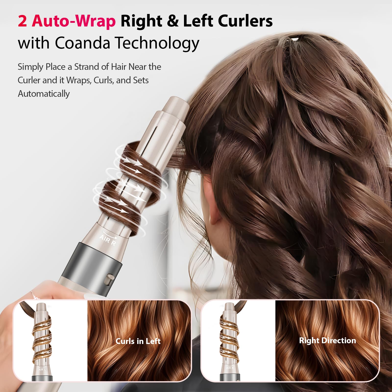 - 1.25' Air Automatic Wrap Curler: Designed to work seamlessly with our rotating hair dryer brush, this air curler utilizes Coanda Technology to automatically wrap and curl your hair, with two curlers included, you can create stunning curls in different directions, enhancing the versatility of your styling.