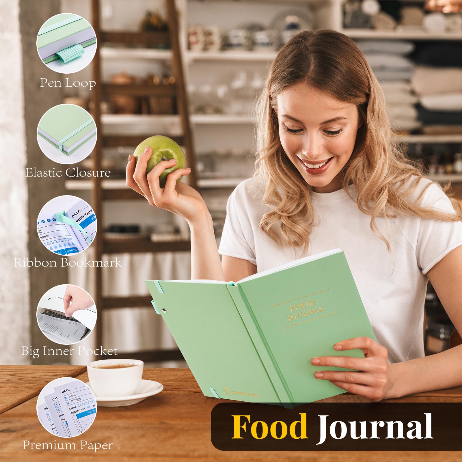 5 MINUTES A DAY Food Journal, Weight Loss Journal for Women, Food Diary to Track Meals, A5 Size Calories Counter Book, 180 Days Diet Wellness Planner for Healthier Lifestyle -Green