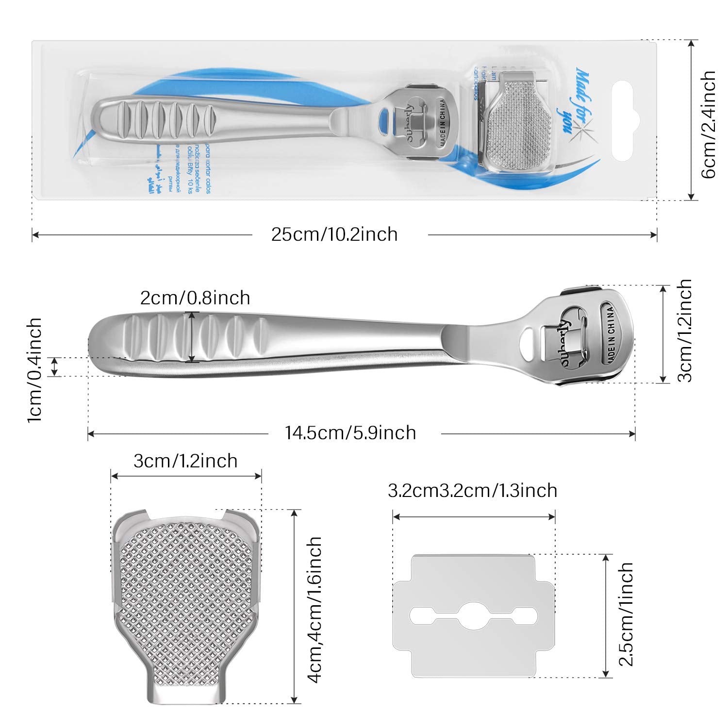 - Callus shaver sets: totally 52 pieces in a package, containing 50 replacement blades, 1 callus shaver (stainless steel handle) and 1 foot file head, smooth design for comfortable grip and control, with easily removable head for changing blades or loading rasp file