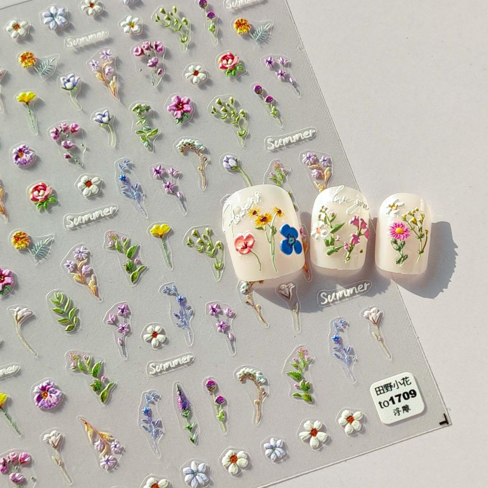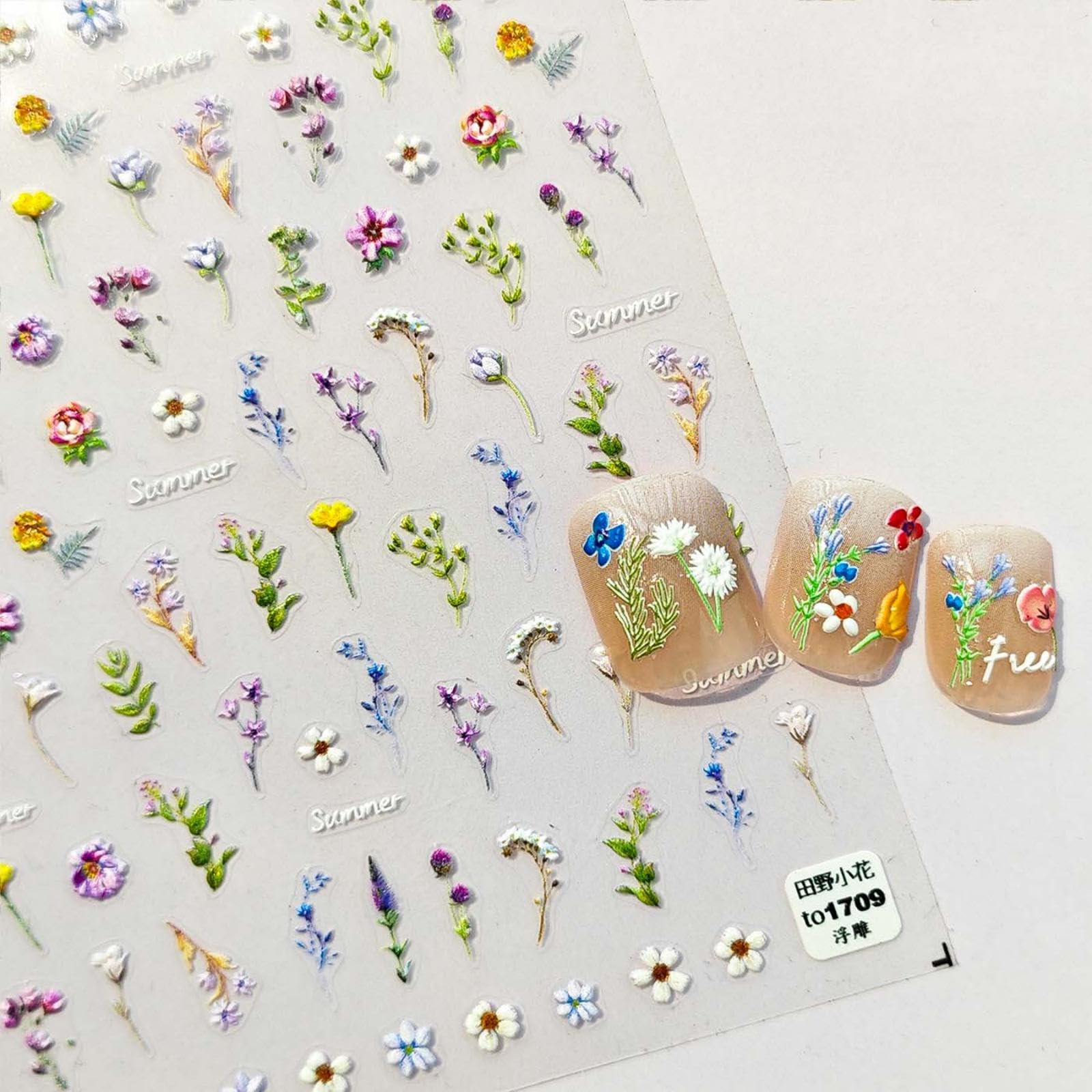 - Flower Nail Decals: 1 sheet of 5D embossing carving patterns litter fresh petal flower plant nail stickers give people an intuitive and advanced exquisite feeling. Floral daisy five-petal flower plant elements spring summer design nail decals are perfect for decorations for your spring summer nails