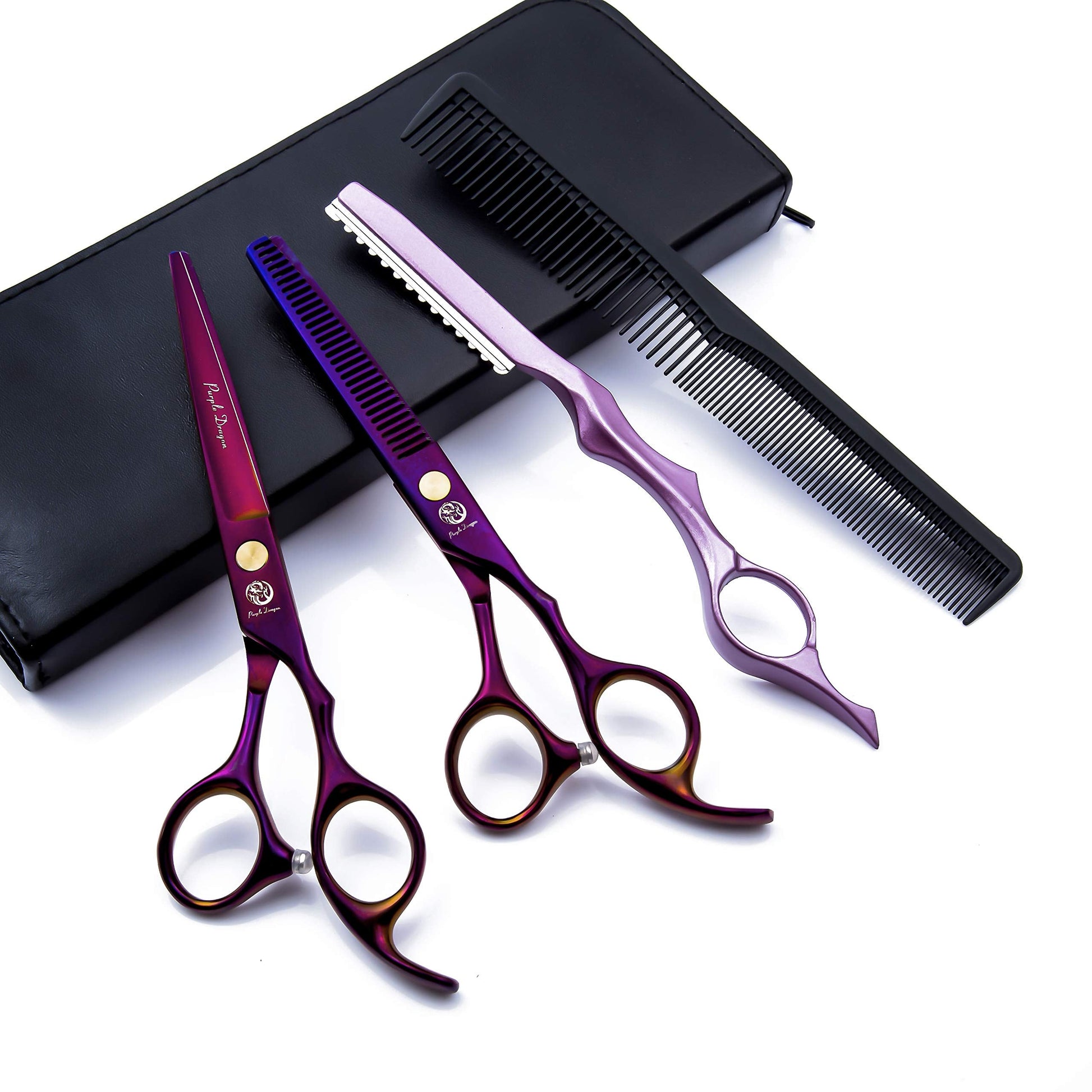 6.0 inch Purple Hair Cutting Scissors Set with Razor, Leather Scissors Case, Barber Hair Cutting Shears Hair Thinning/Texturizing Shears for Professional Hairdresser or Home Use