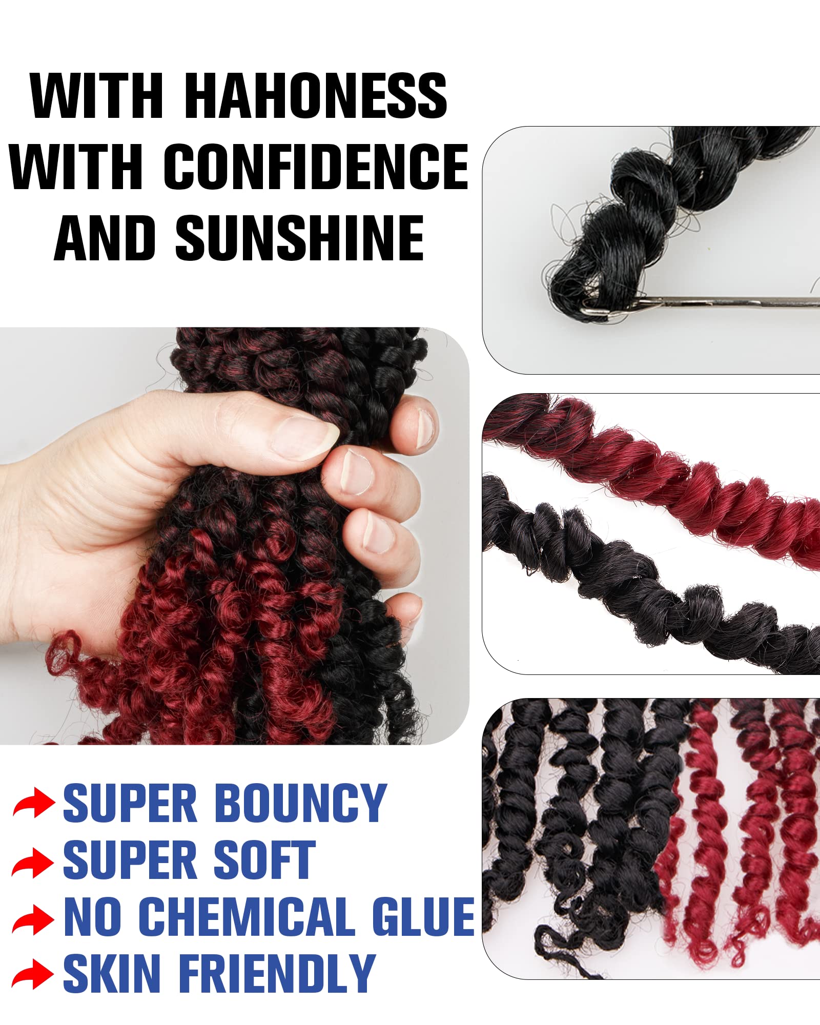 - 1.Fasion Style:Hahoness Pre-twisted Passion Twist Crochet Hair Is Made Of Spring Kinky Twist Bohemian Curls With High Quality Flame-retardant Hot Water Setting Low Temperature Synthetic Fiber.