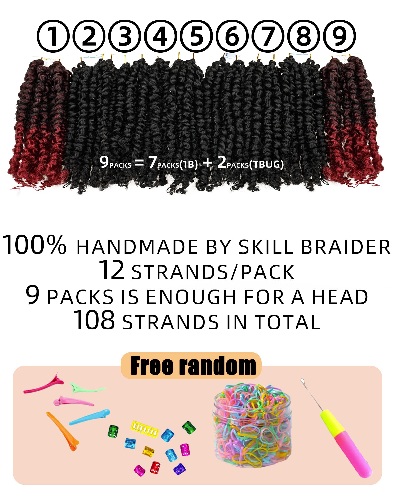 - 4.Package Include:7 Packs 1B(Natural Black) & 2 Packs (T1B/BUG)Ombre Burgundy 6 inches Passion Twist Crochet Hair+1 Crochet Needle+DIY Bag(5 Pcs Hairpins &10 Pcs Colorful Hair Accessories &100+ Pcs Rubber Brands ).