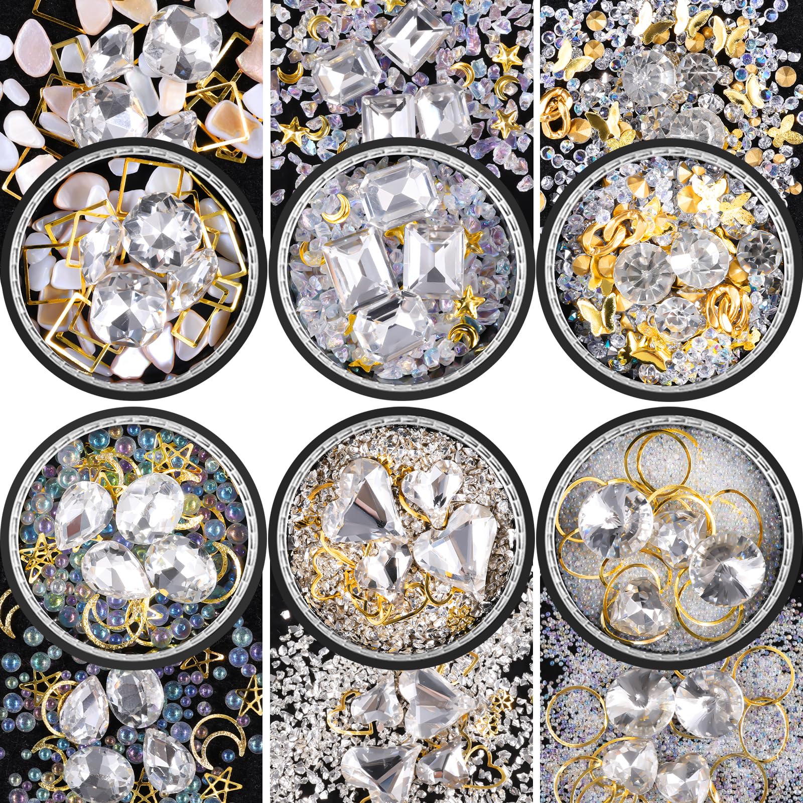 6 Wheels Mixed Sparkle Nail Art Rhinestones Diamonds Crystals Butterfly Beads Artificial Pearls Gold Silver Nail Studs Gems Metal Hollow Rivets Charms (White)