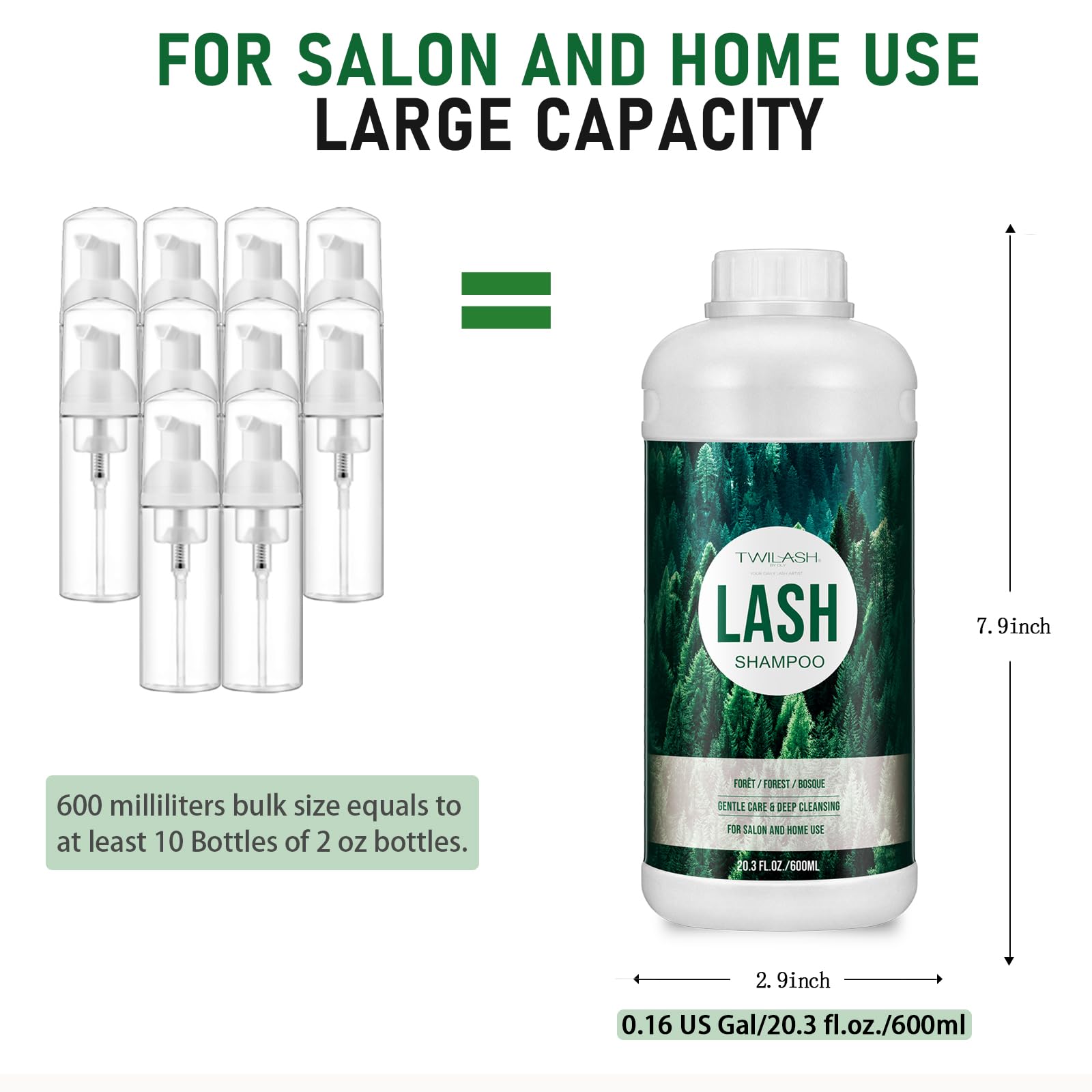 600ml Lash Shampoo Bulk, Eyelash Cleanser for Extensions, Safe Makeup Remover, Non-irritating or Burning Formula Eyelid Foaming Cleanser Best for Professional Salon and Home Use (Forest)