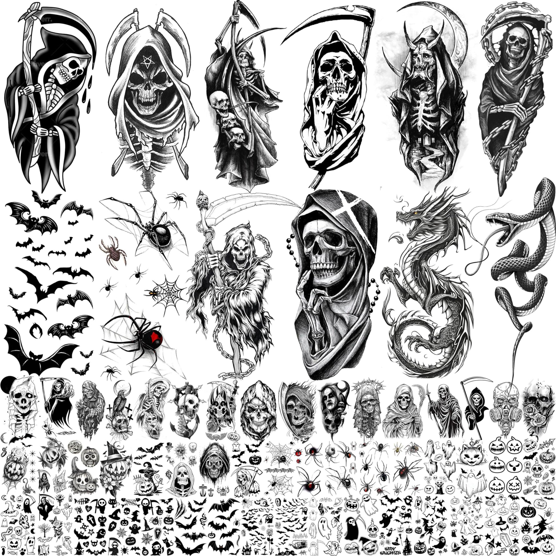 - 🍷61 Sheets Halloween Temporary Tattoos Sticker Fashion Designs🍸 EGMBGM Brand Original Evil Demon Devil Death Skull Scary Skeleton Bat Ghost Shark Spiderweb Spider Gothic Pumpkin Dragon Snake Temporary Tattoos For Adults. There Are 12 Sheets 19x9.5CM 7.4'x3.7' Large Arm Sleeve Tattoos For Men and 49 Sheets 10.5x6CM 4.1'x2.3' Fun Cute Tiny Small Temporary Tattoos For Women In Each Package.